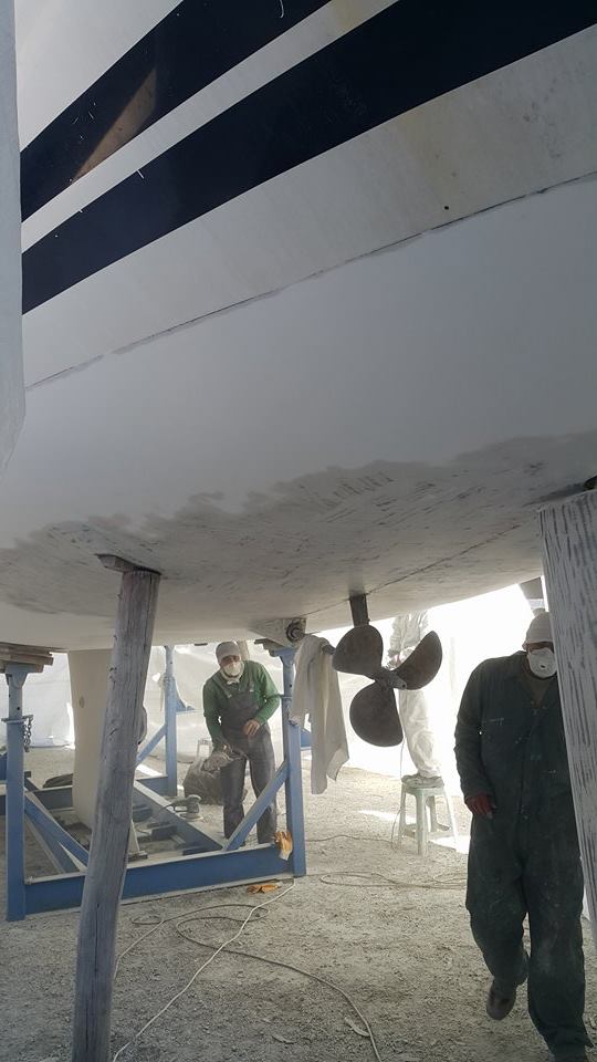 Grattage de toute la carène et remise en état de la coque avant le polishage