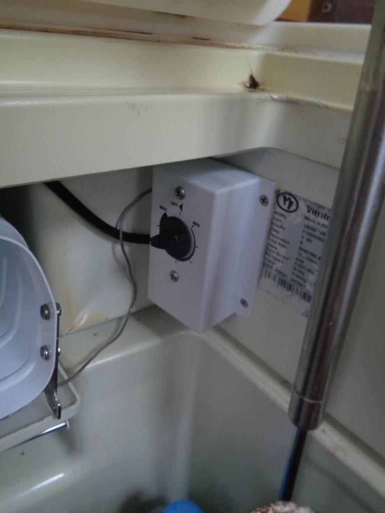 En fin de matinée opération maintenance du frigo. En effet, la sonde du thermostat s’est détachée de l’évaporateur ce qui peut entrainer un mauvais fonctionnement. Nous sommes à la voile donc réparation de fortune avec positionnement de la sonde en avant de l’évaporateur. Dans un moment de calme je la repositionnerai derrière l’évaporateur.