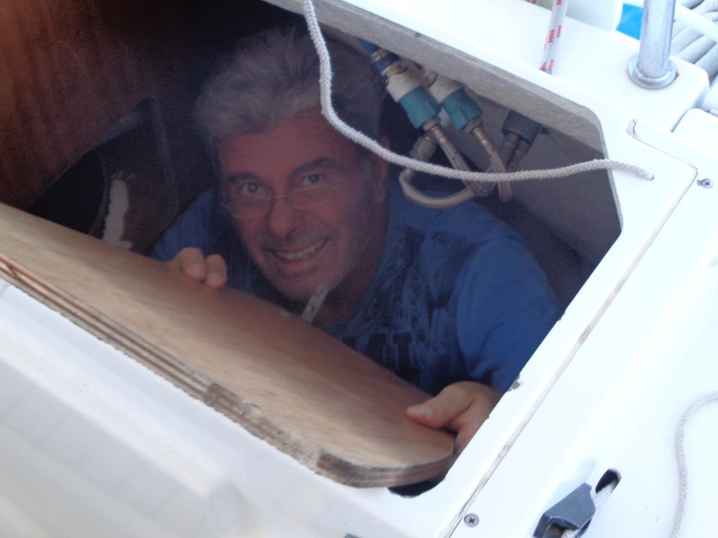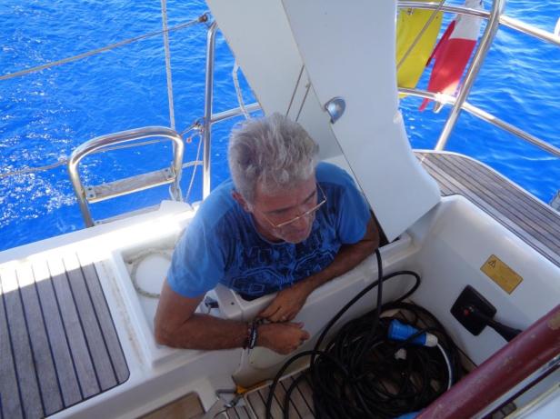 Ce matin le captain a 2 missions : la première nettoyer les plexis pleins de sel de la capote et la seconde vérifier le pilote automatique qui fait des bruit de grincement. Pour la première rien de plus simple un fond d’eau dans une bassine et 2 chiffons plus une peau de chamois et le tour est joué. Pour la seconde c’est un peu plus compliqué car il faut passer par le coffre arrière tribord.