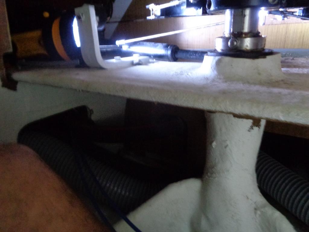 Ce matin nouvelle descente dans les coffres arrières car le grincement perdure. Après investigation, il s’agit toujours du même phénomène. En effet, le nouveau pilote automatique est installé sur un support en inox fixé sur la structure du bateau qui supporte la mèche de safran (gouvernail).