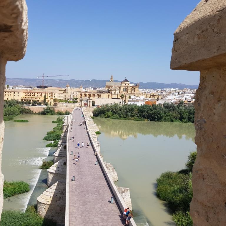 Notre guide historienne est absolument captivante et fait attention à sa diction sachant qu’il y a des étrangers, nous français plus un couple de portugais. Elle nous apprend que Cordoue est classée 4 fois au patrimoine mondiale de l’humanité. Nous démarrons par le pont romain puis la roue à eau, l’Alcazar (extérieure), les murailles, la maison de l’indien, le minaret saint jean pour finir par la place Tendillas.