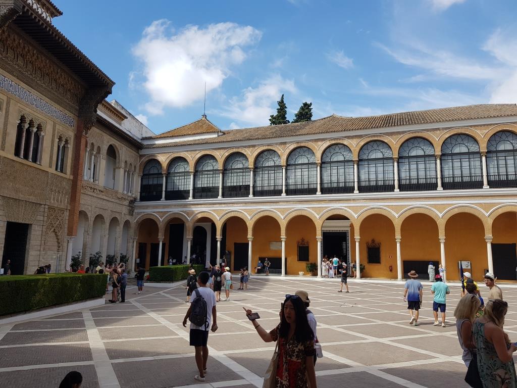 El Real Alcázar de Sevilla, est un palais fortifié (alcazar) construit par les Omeyyades d’Espagne et modifié à plusieurs reprises pendant et après la période musulmane. Il est considéré comme l’exemple le plus brillant de l’architecture mudéjar sur la péninsule Ibérique. La famille royale d’Espagne utilisait encore très récemment l’étage, mais préfère actuellement l’hôtel Alphonse XIII situé juste à côté. Pour indiquer leur présence, le drapeau de l’entrée touristique est baissé.