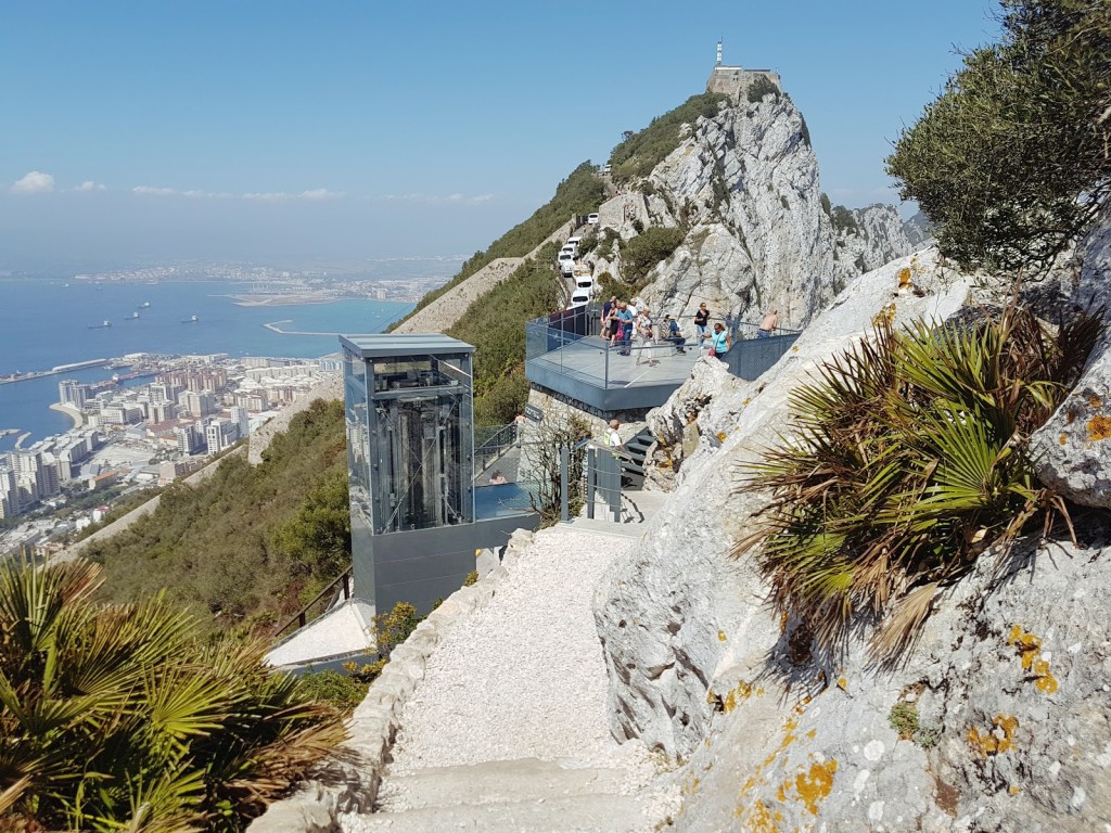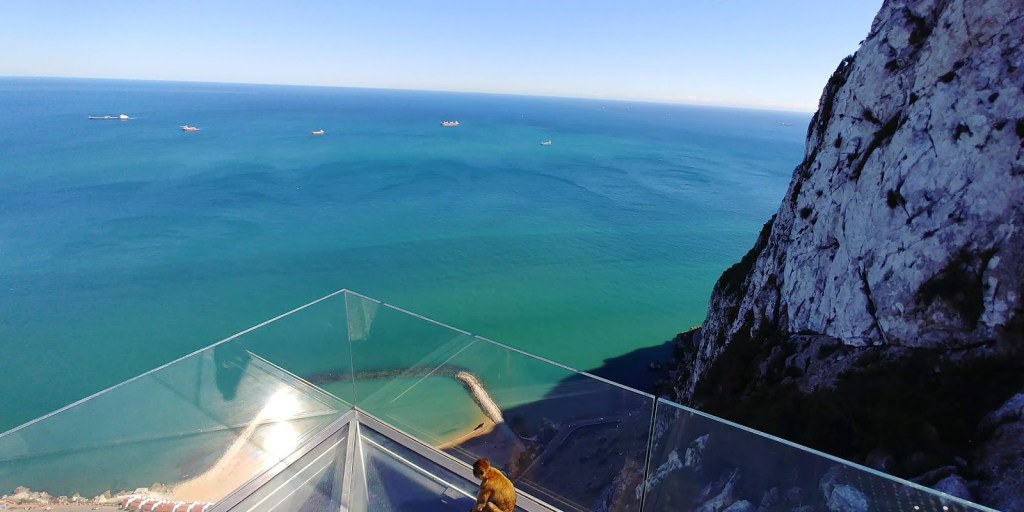 Arrivés au sommet la vue est imprenable sur la baie de Gibraltar ou baie d’Agésiras (nom du terminal ferries côté espagnol). Nous débutons par une balade de 20 minutes pour rejoindre Skywalk Gibraltar où l’on marche sur un plancher de verre qui nous donne l’impression de marché dans le ciel.