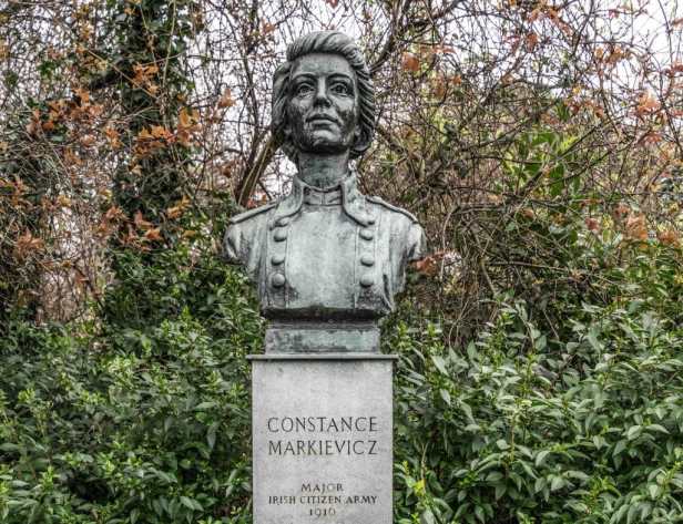 A la sortie, nous allons manger au KC peaches cafe and Castering, c’est mode gouter, une tarte citron meringuée et un cookie chocolat avec un chocolat chaud pour moi et une tarte framboises et un cookie cannelle avec un thé pour Carine. Un fois bien caler nous allons à St Stephen’s Green joli parc boisé avec en son milieu la statue de Constance Markiewicz, l’une des héroïnes de l’insurrection de Pâques 1916.