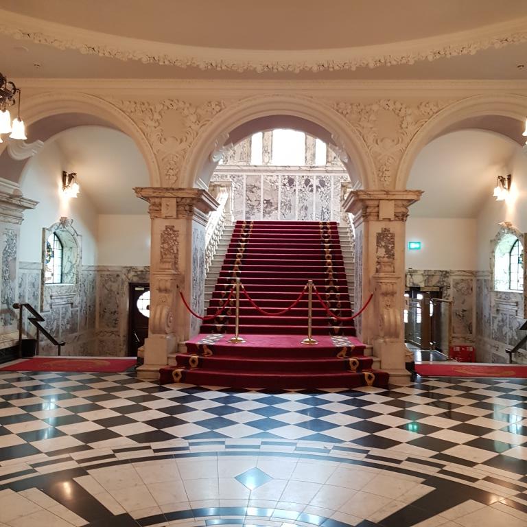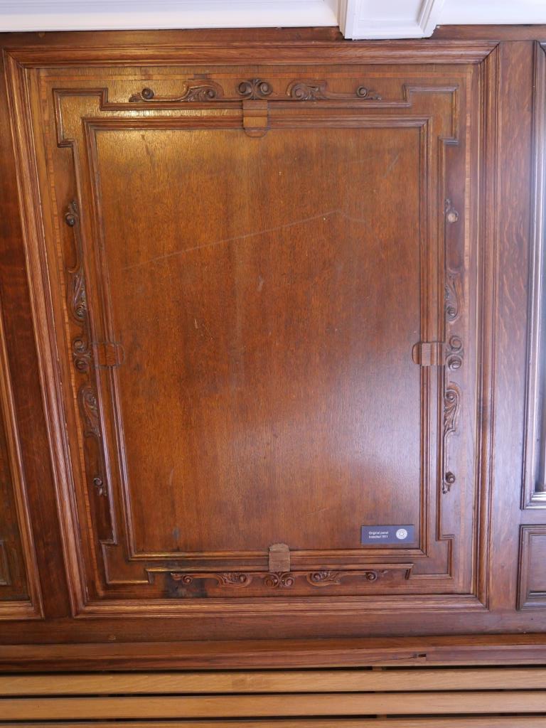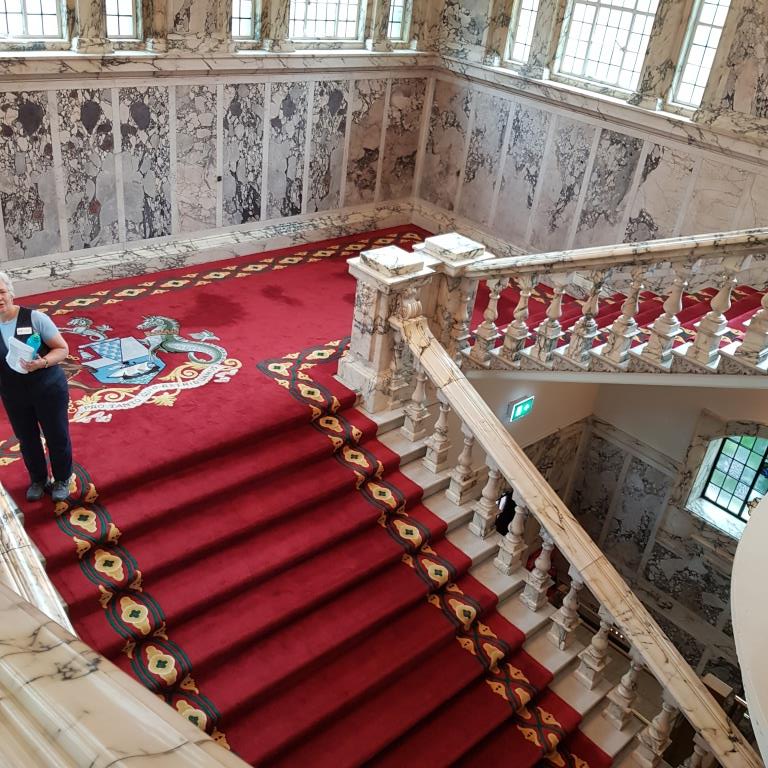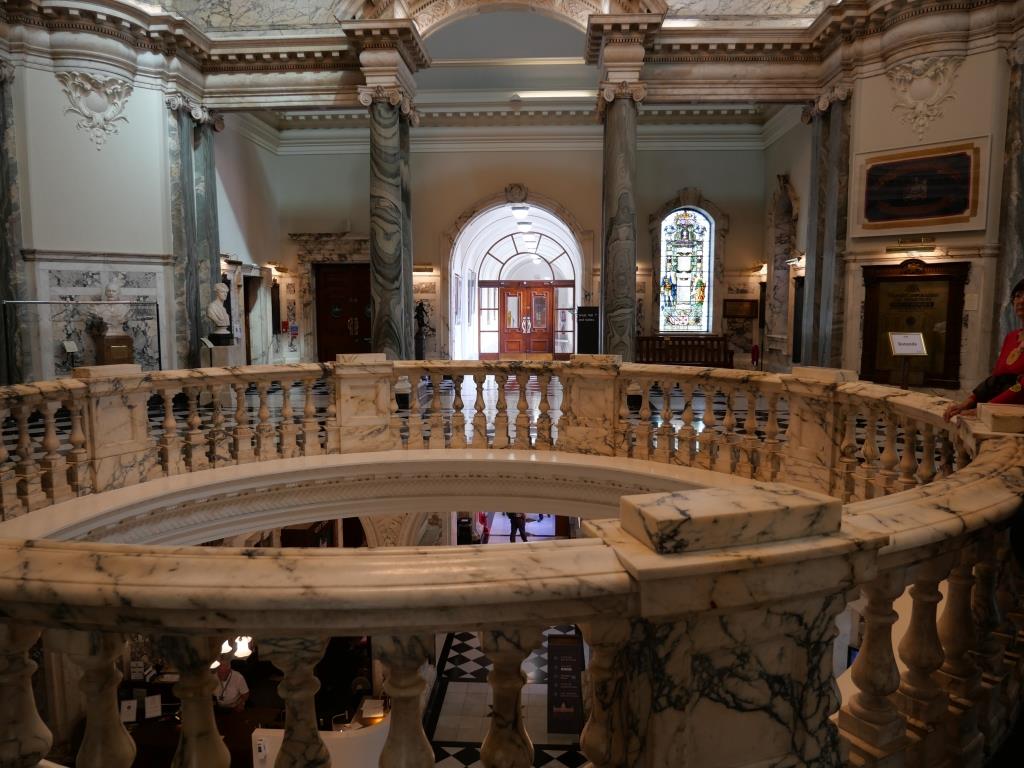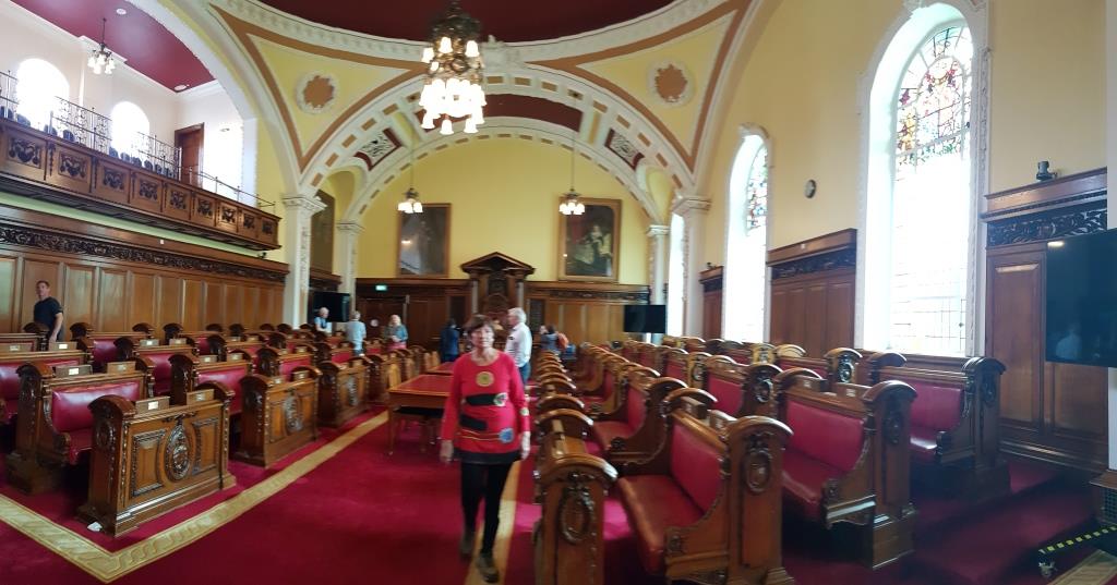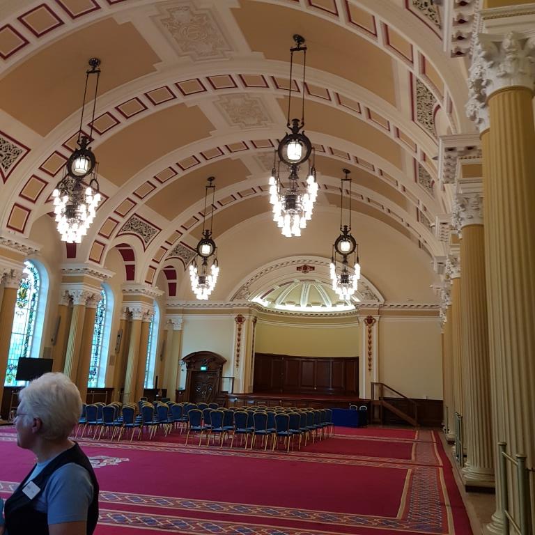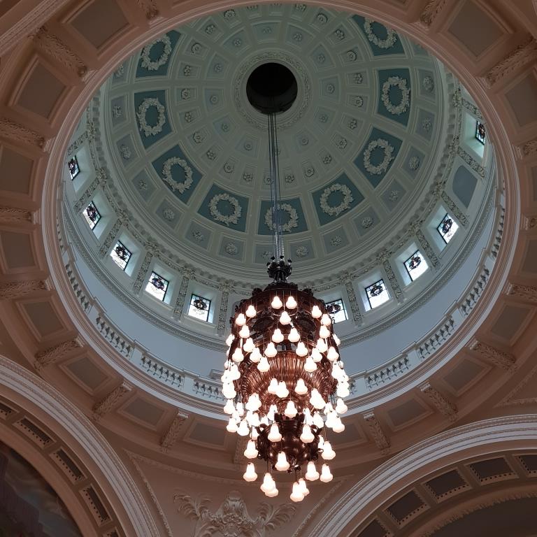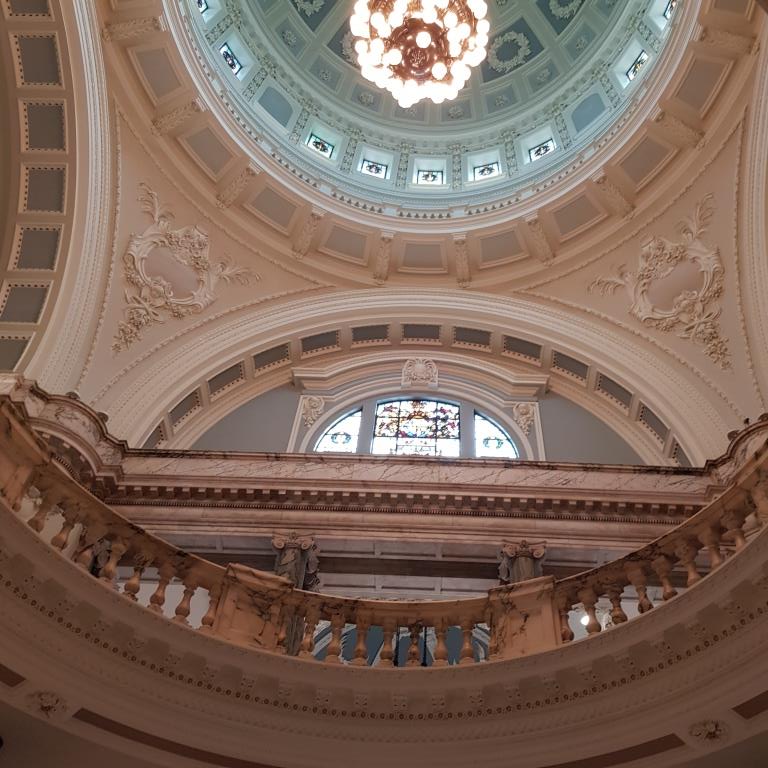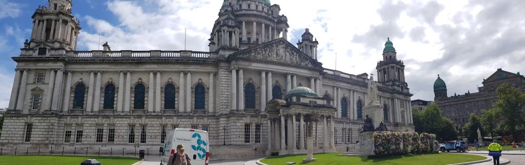 Nous reprenons le direction et allons visiter le city hall appelé ici le Titanic de pierre qui fut le siège du 1er parlement d’Irlande du nord en 1921. Nous avons la chance d’arriver juste avant le démarrage d’une visite guidée qui va nous permettre de visiter des pièces inaccessibles au public, comme la salle du conseil où siégeait le parlement. L’intérieur présente un certain nombre de caractéristiques remarquables, notamment la porte-cochère et la grande entrée, le grand escalier, la salle de réception et la salle de banquet. Le toit au-dessus de la salle de banquet a été détruit lors du blitz de Belfast dans la nuit du 4 au 5 mai 1941 et a dû être reconstruit. Les marbres de Carrare, Pavonazzo et Brescia sont largement utilisés dans l’édifice, tout comme les vitraux représentant entre autres les armoiries de Belfast, les portraits de la reine Victoria et de Guillaume III et les blasons des provinces d’Irlande. Il y a aussi un vitrail commémorant la 36e division (Ulster).