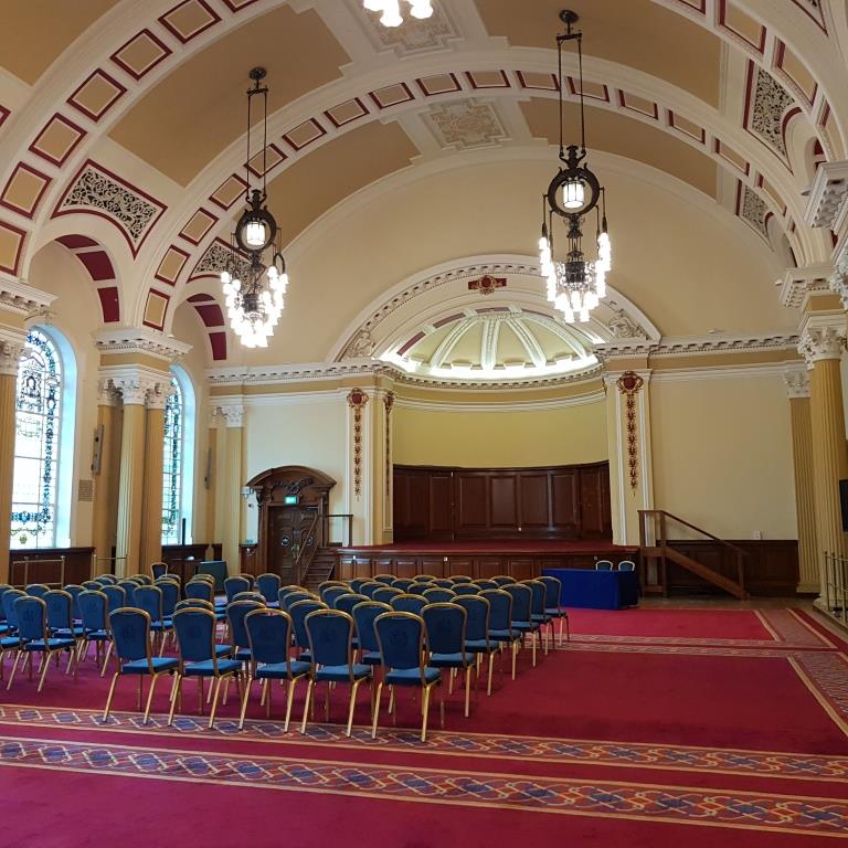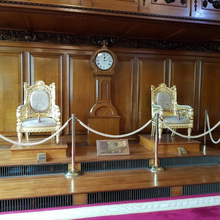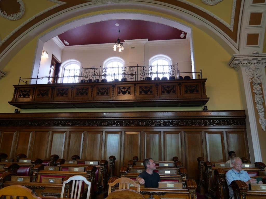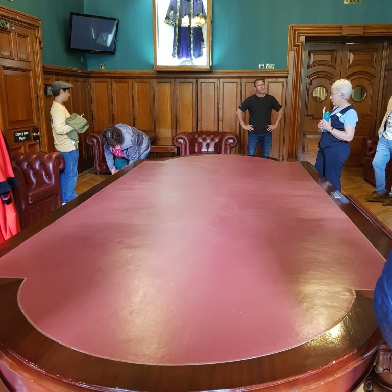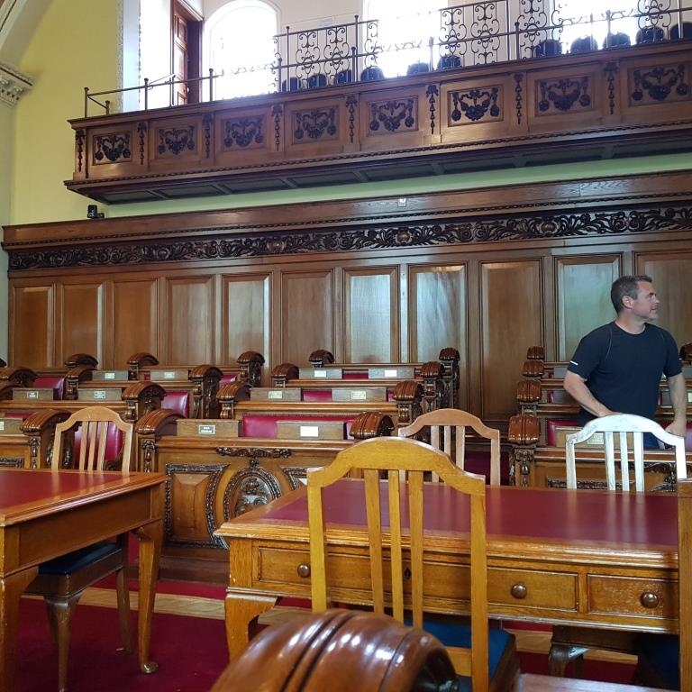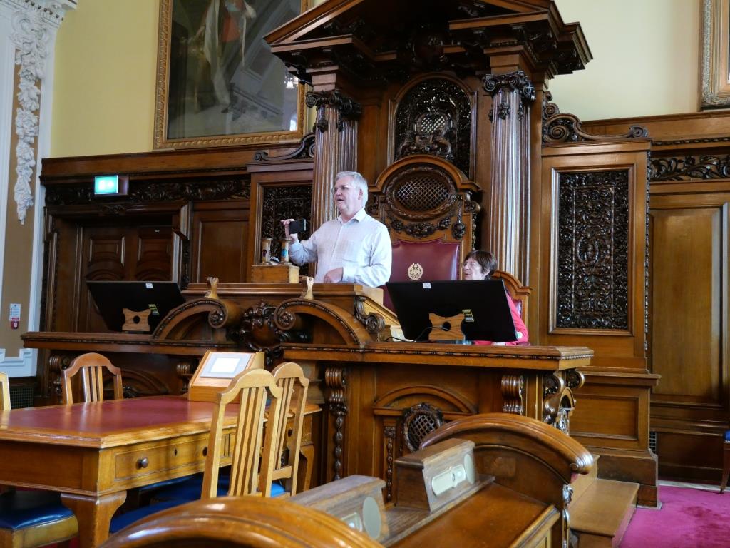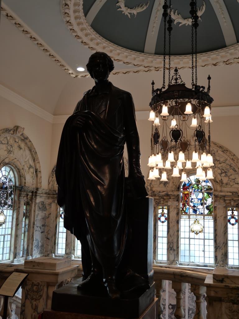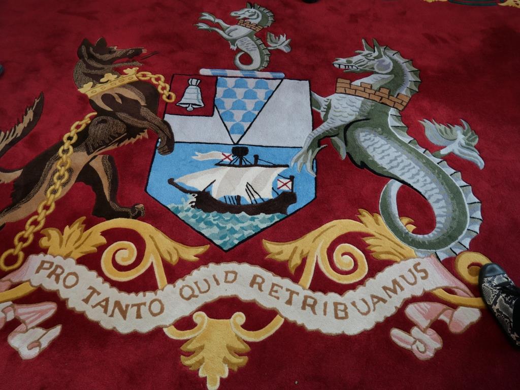 Nous reprenons le direction et allons visiter le city hall appelé ici le Titanic de pierre qui fut le siège du 1er parlement d’Irlande du nord en 1921. Nous avons la chance d’arriver juste avant le démarrage d’une visite guidée qui va nous permettre de visiter des pièces inaccessibles au public, comme la salle du conseil où siégeait le parlement. L’intérieur présente un certain nombre de caractéristiques remarquables, notamment la porte-cochère et la grande entrée, le grand escalier, la salle de réception et la salle de banquet. Le toit au-dessus de la salle de banquet a été détruit lors du blitz de Belfast dans la nuit du 4 au 5 mai 1941 et a dû être reconstruit. Les marbres de Carrare, Pavonazzo et Brescia sont largement utilisés dans l’édifice, tout comme les vitraux représentant entre autres les armoiries de Belfast, les portraits de la reine Victoria et de Guillaume III et les blasons des provinces d’Irlande. Il y a aussi un vitrail commémorant la 36e division (Ulster).