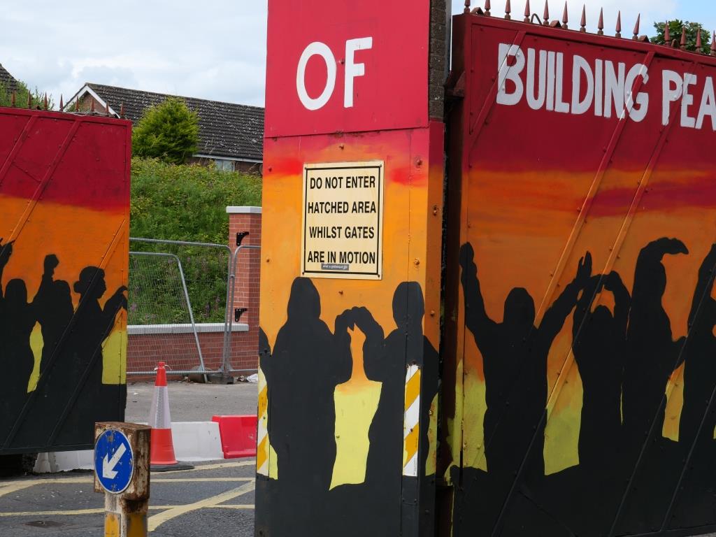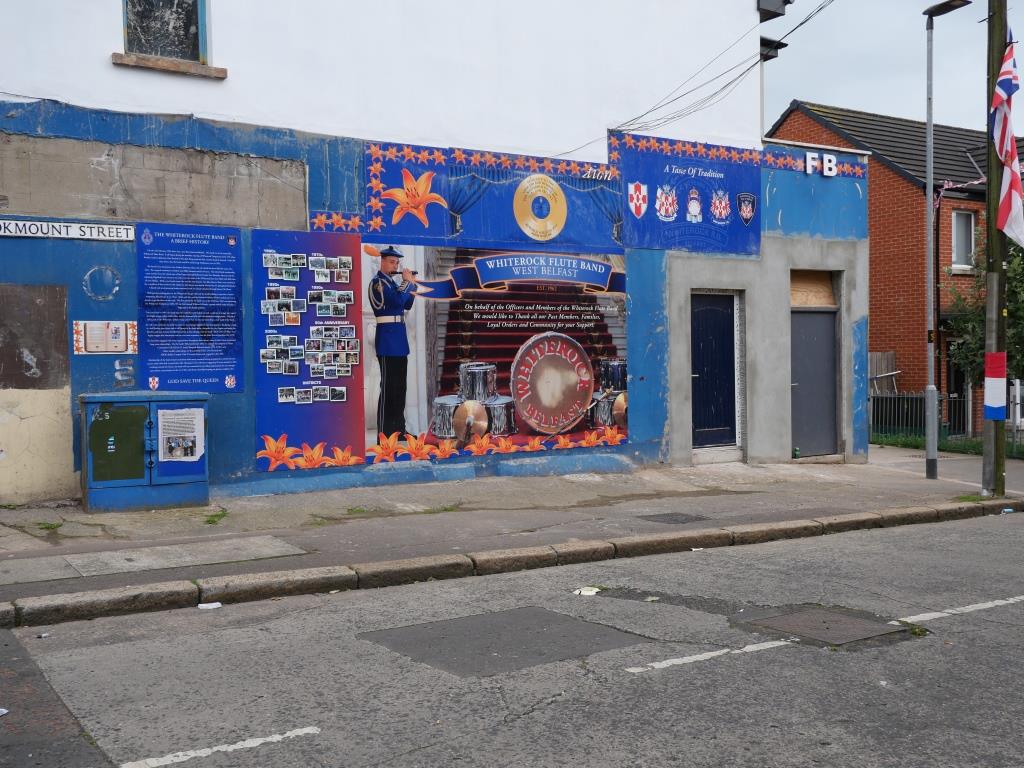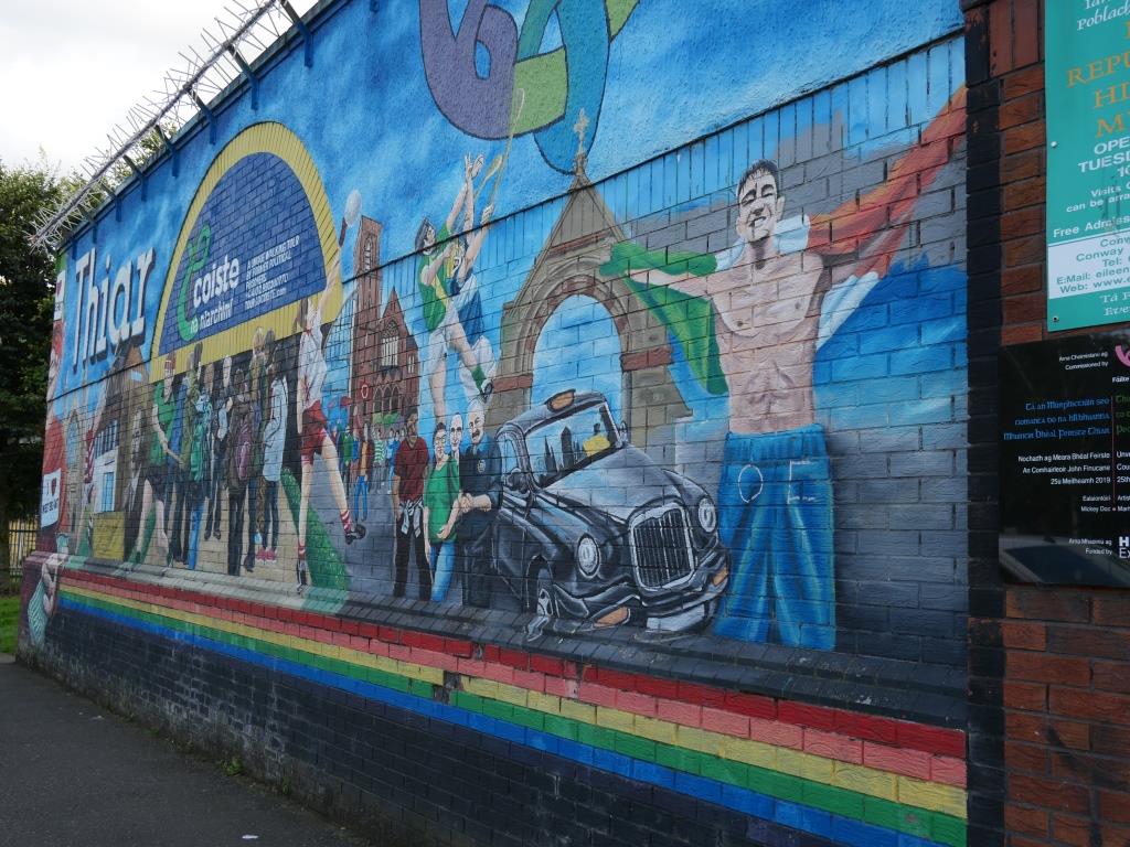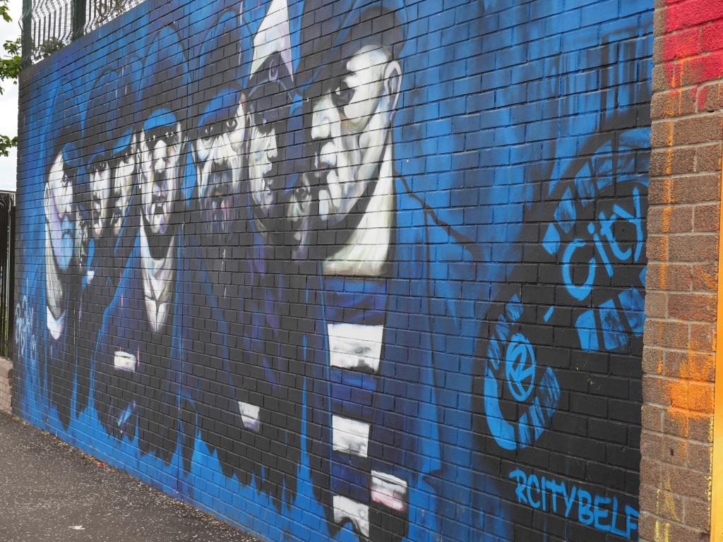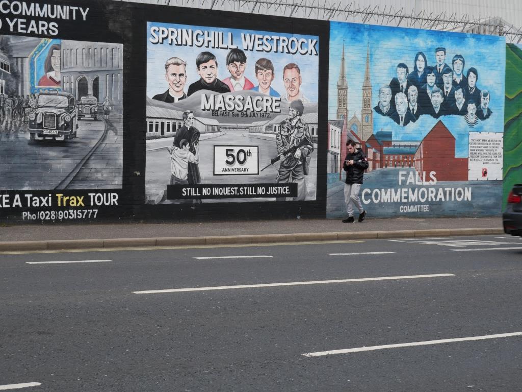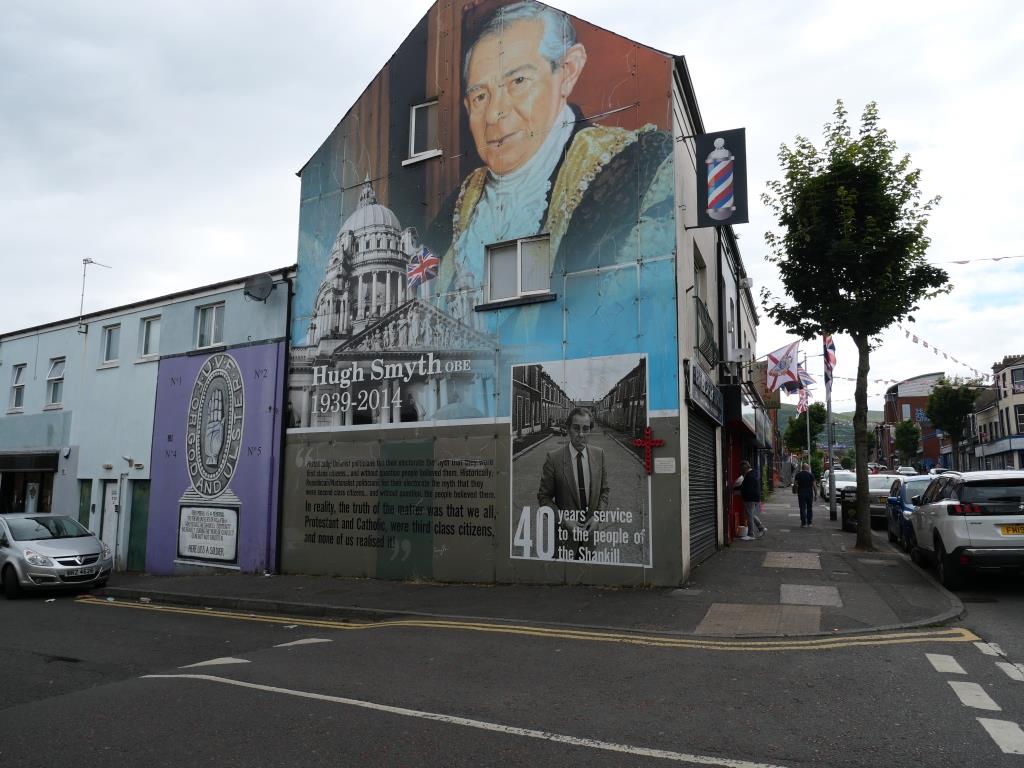 Nous allons ensuite voir les fresques loyalistes du quartier de Shankill essentiellement sur Shankill Road. Nous empruntons ensuite une des 2 rues qui passe la Peace Line genre de mur de Berlin qui sépare encore par de lourdes portes les quartiers falls catholiques du shankill. Ces portes peuvent encore être fermées lors de périodes de très grandes tensions ou lors de certaines festivités. Nous parcourons ensuite la Springfield Road théâtre de nombreux affrontements à l’époque de la présence incongrue d’une caserne de l’armée britannique aujourd’hui démantelée.