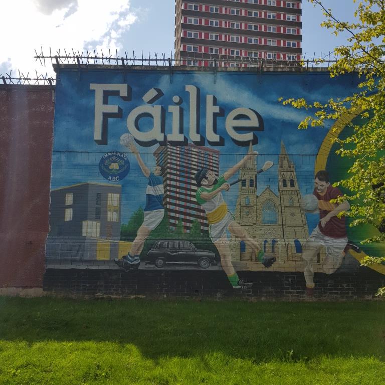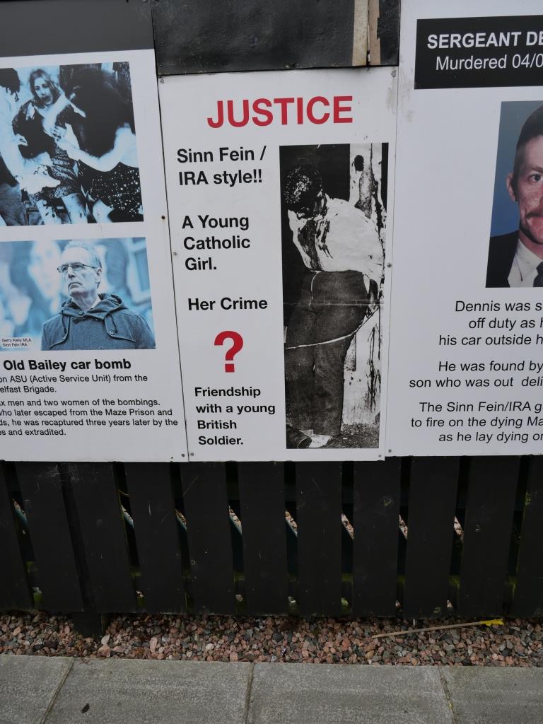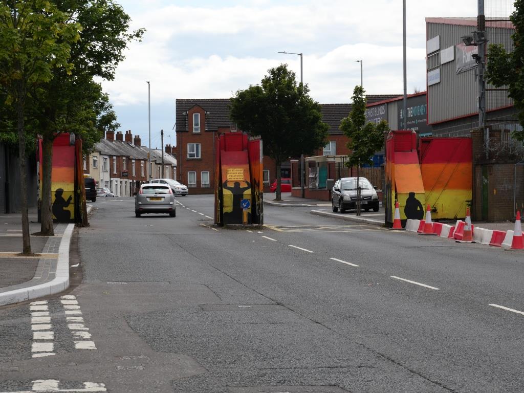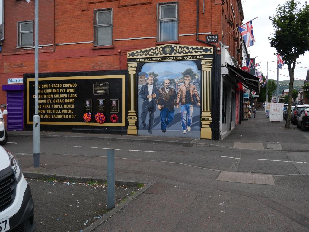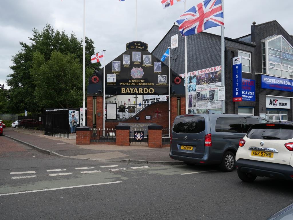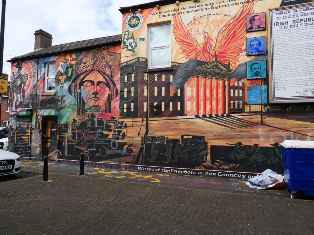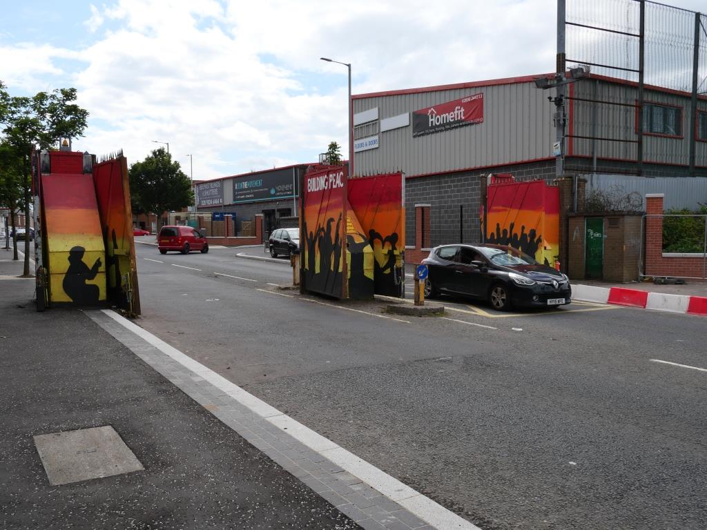 Nous allons ensuite voir les fresques loyalistes du quartier de Shankill essentiellement sur Shankill Road. Nous empruntons ensuite une des 2 rues qui passe la Peace Line genre de mur de Berlin qui sépare encore par de lourdes portes les quartiers falls catholiques du shankill. Ces portes peuvent encore être fermées lors de périodes de très grandes tensions ou lors de certaines festivités. Nous parcourons ensuite la Springfield Road théâtre de nombreux affrontements à l’époque de la présence incongrue d’une caserne de l’armée britannique aujourd’hui démantelée.