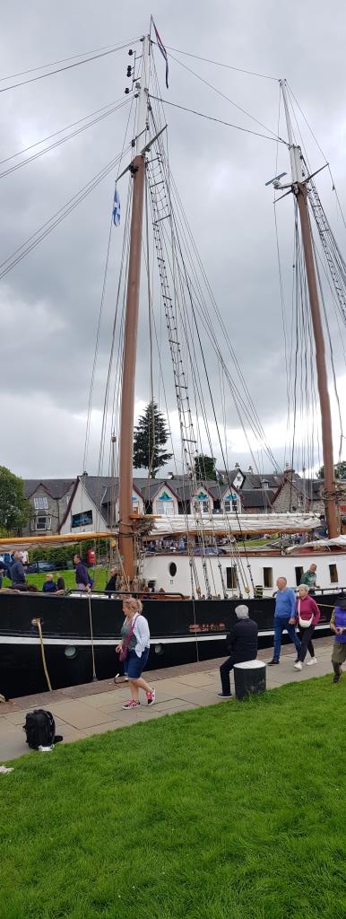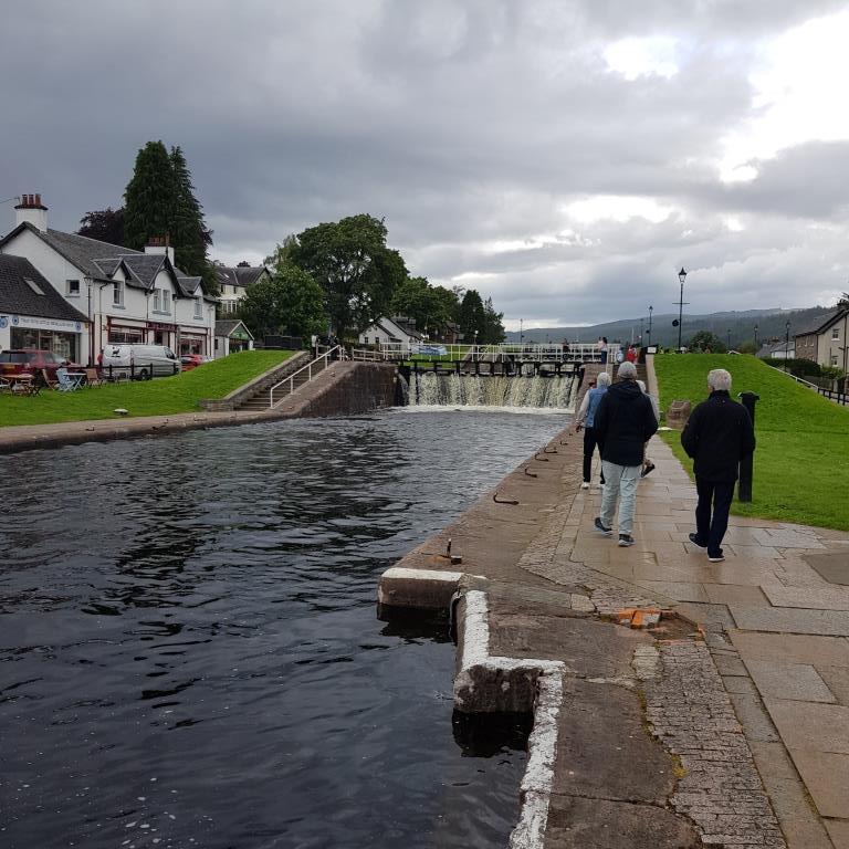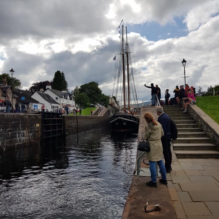 Mercredi 26 juillet nous quittons l’ile de Skye et allons à Fort Augustus petite ville située à la fin du Loch Ness dans son sud ouest. La principale attraction de cette ville est le Caledonian canal, canal creusé au début du XIXe siècle pour relier Corpach près de Fort William sur le Loch Ness (côté mer d’Écosse) à Inverness sur le Beauly Firth (côté mer du Nord) en évitant le périlleux contournement du nord de l’Écosse. Long de plus de 96 kilomètres il suit le Great Glen dans les Highlands. Son tracé traverse trois grands lacs, le loch Lochy, le loch Oich et le loch Ness, si bien que 35 kilomètres seulement sont constitués de canaux artificiels qui comportent 29 écluses. Après avoir regardé le passage de l’écluse d’un vieux gréement hollandais, nous allons prendre une pinte au pub. Nous retournons tranquillement au camping car.