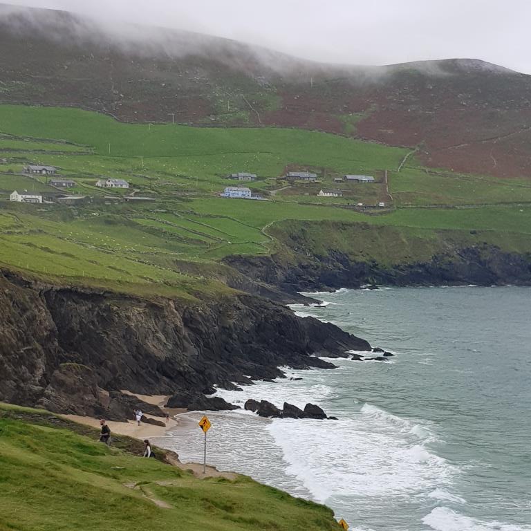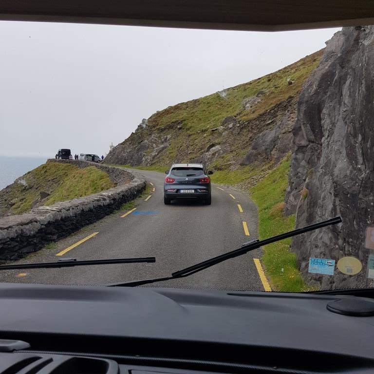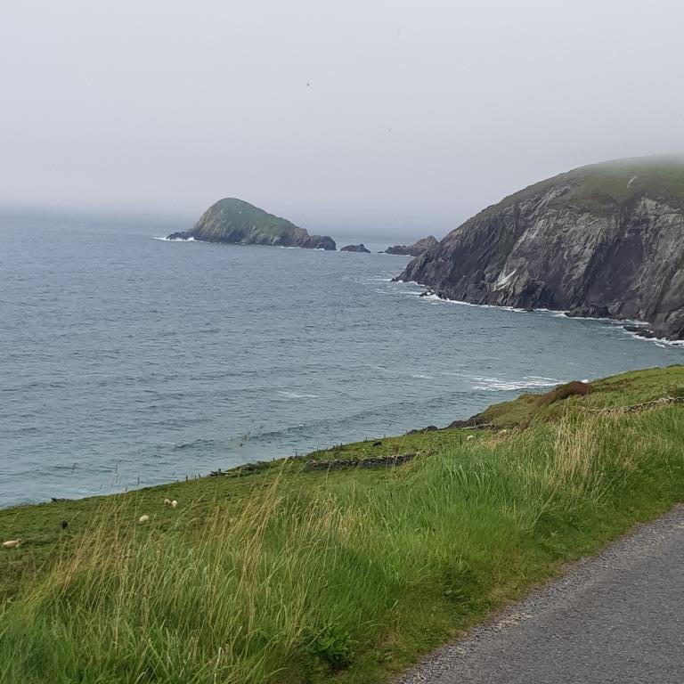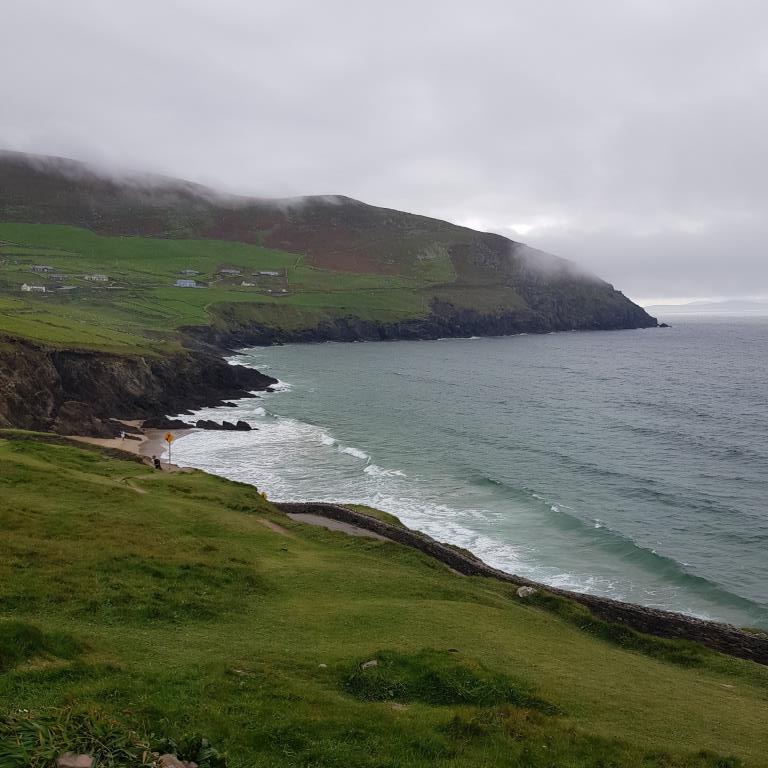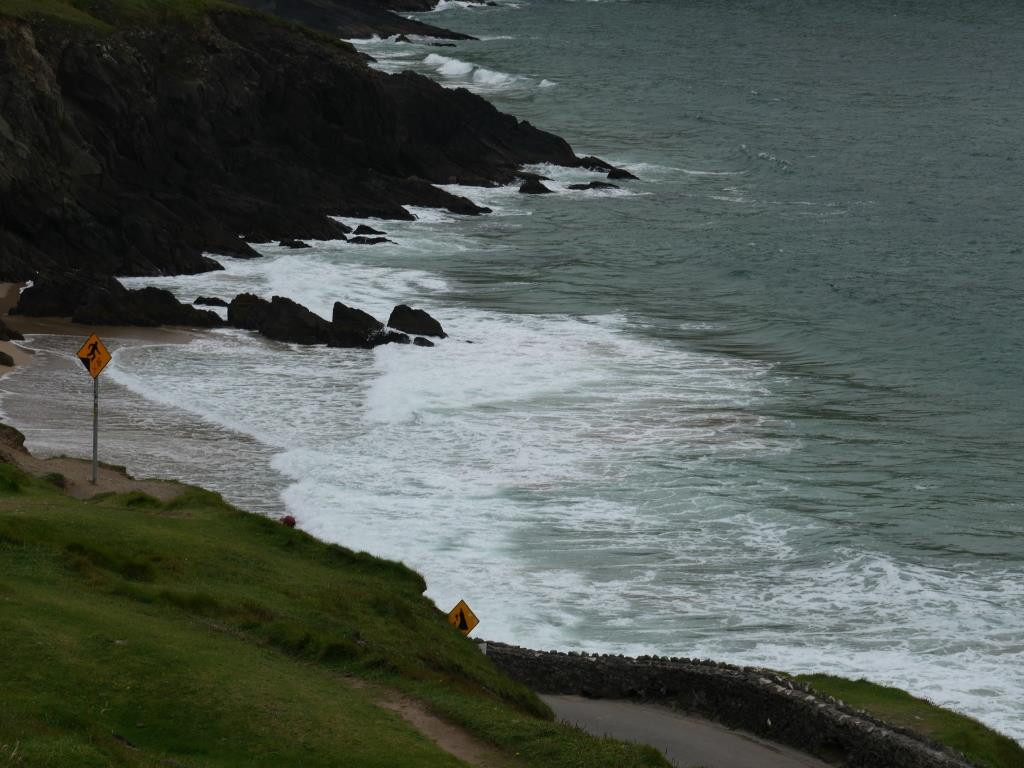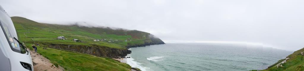Nous entamons véritablement le tour de la péninsule de Dingle ce jour. On attaque dans le dur après Dingle, là, la route est étroite et à certain endroit on ne se croise pas à 2 voitures alors imaginez avec un camping car, qu’à cela ne tienne on va jusqu’à Coumeenool Beach pour y déjeuner. Le spectacle est grandiose mais dommage que la brume s’invite et bouche une partie du paysage comme on peut en juger sur les photos.
