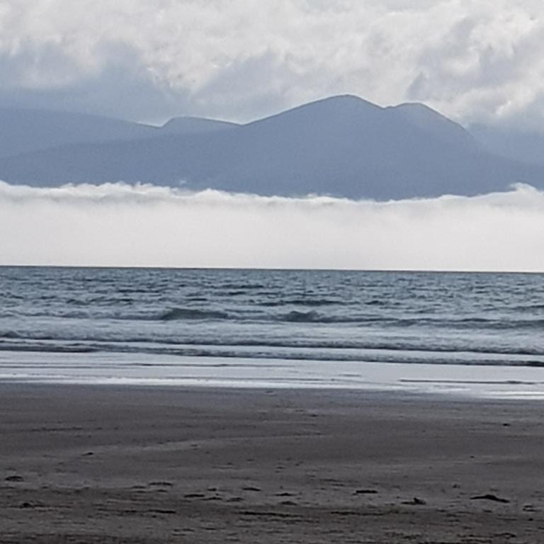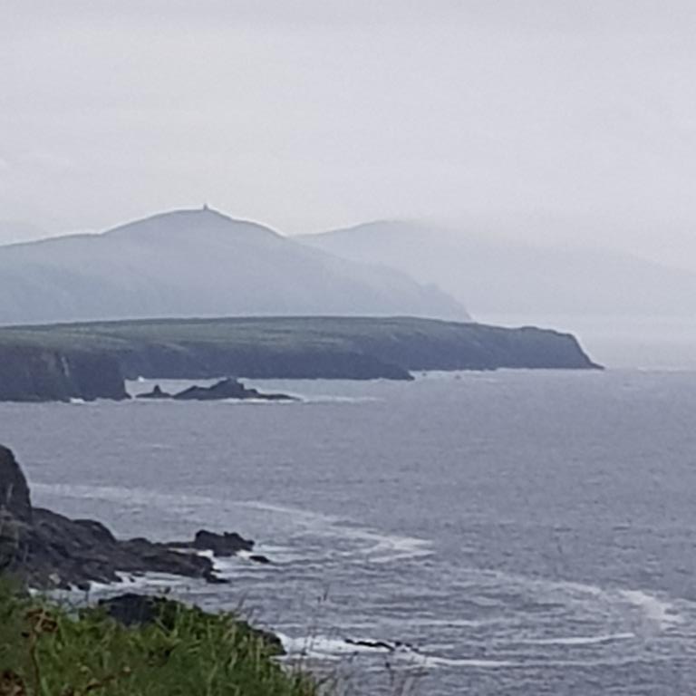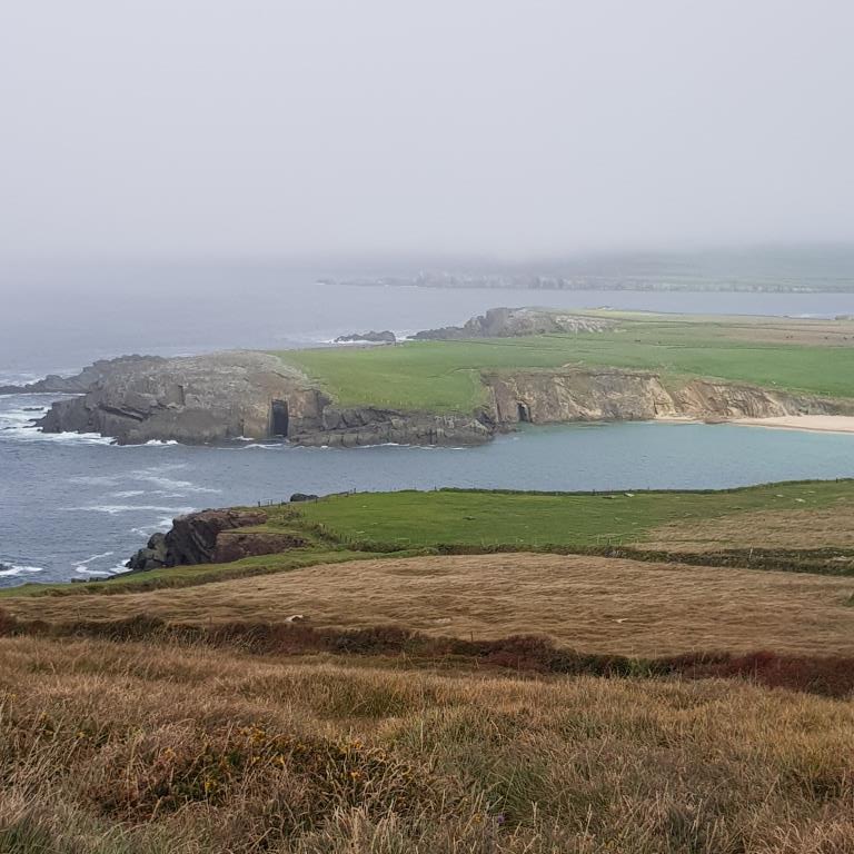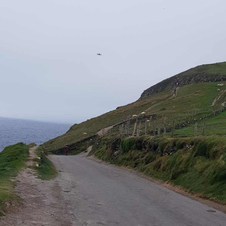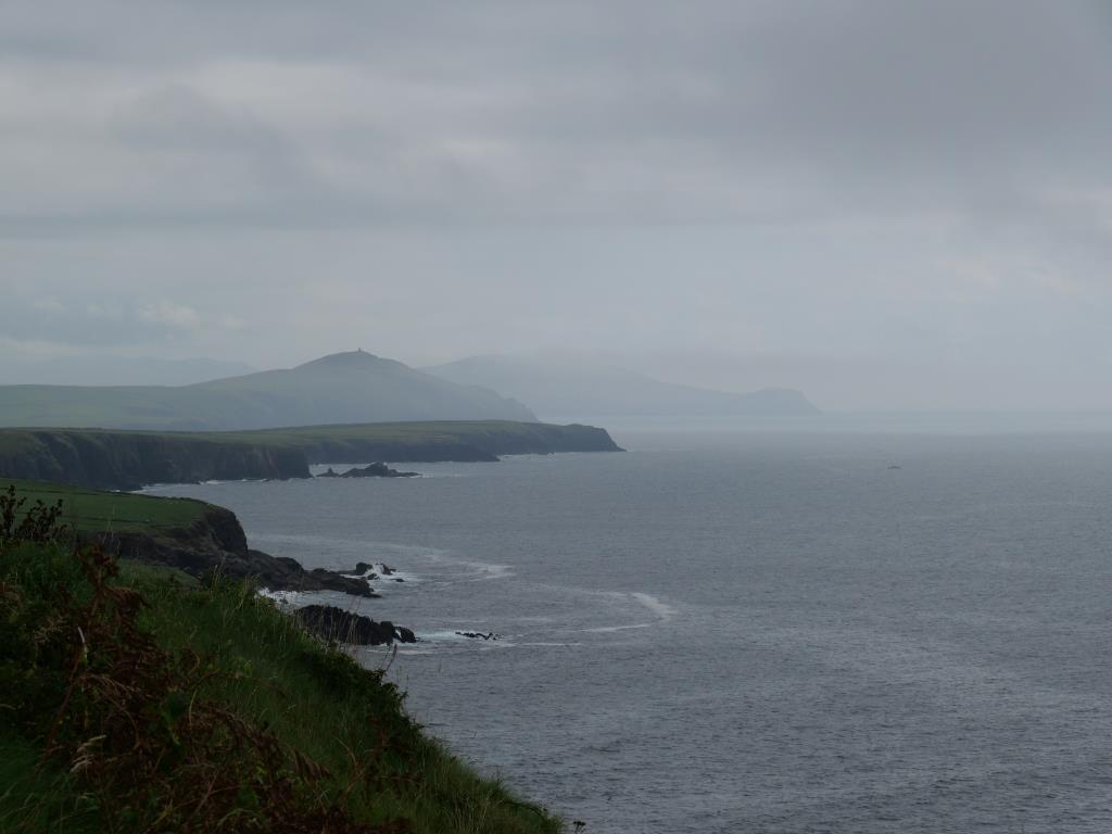 Nous entamons véritablement le tour de la péninsule de Dingle ce jour. On attaque dans le dur après Dingle, là, la route est étroite et à certain endroit on ne se croise pas à 2 voitures alors imaginez avec un camping car, qu’à cela ne tienne on va jusqu’à Coumeenool Beach pour y déjeuner. Le spectacle est grandiose mais dommage que la brume s’invite et bouche une partie du paysage comme on peut en juger sur les photos.
