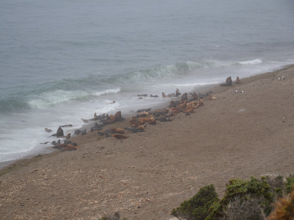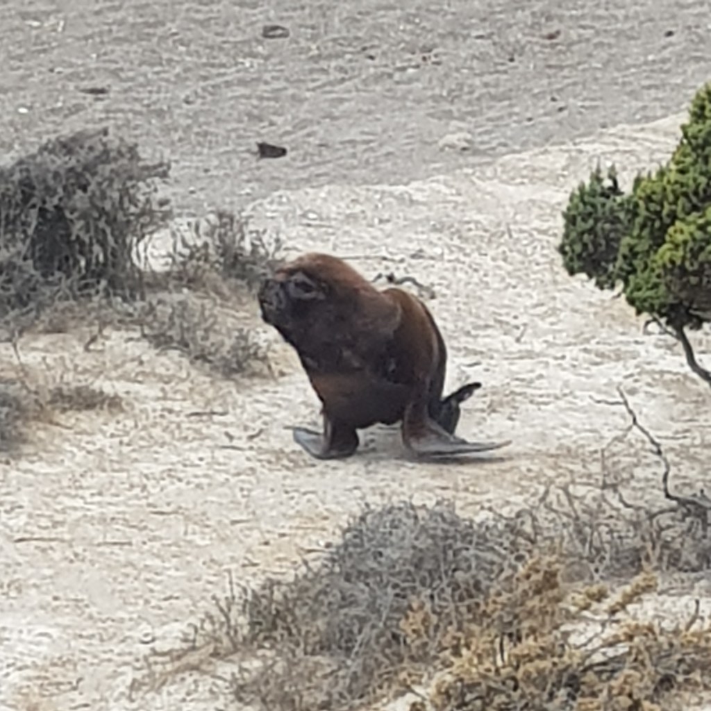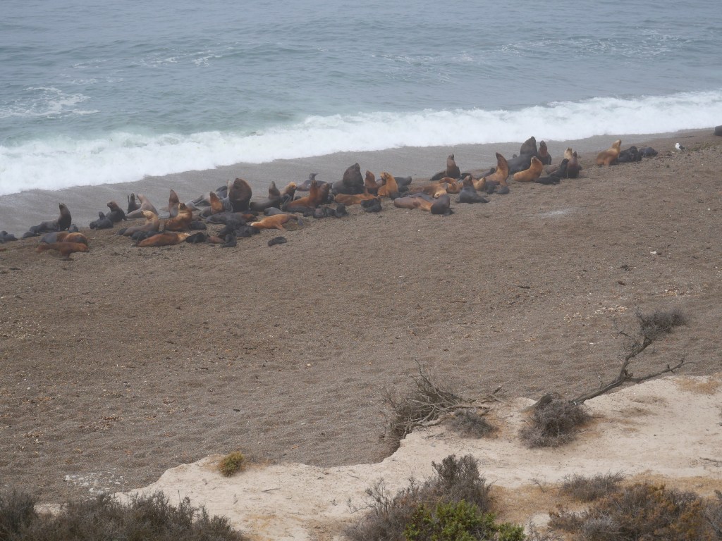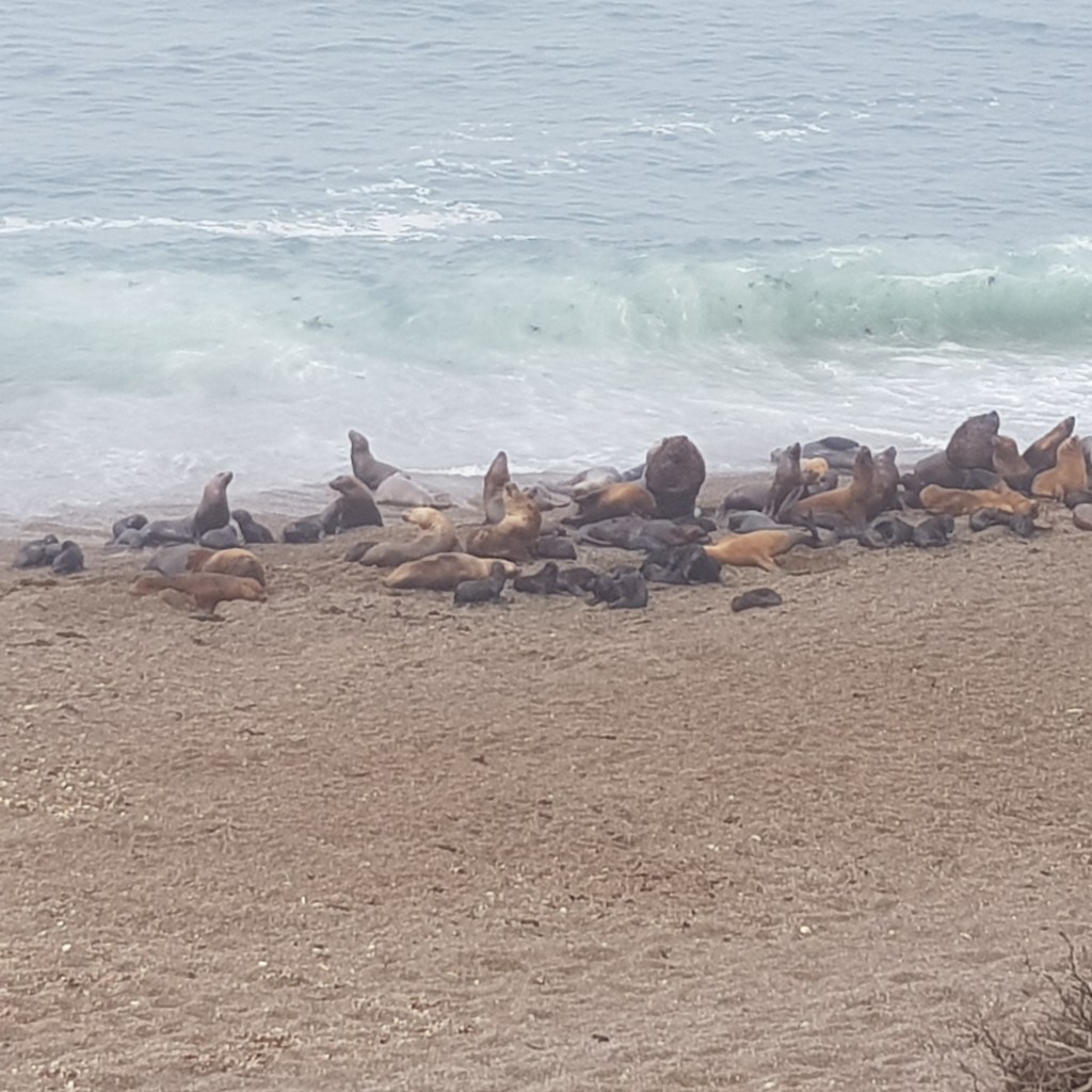 Une fois le ventre plein nous allons à Punta Norte lieu d’observation des lions et des éléphants, c’est également l’endroit où les orques femelle apprennent aux juvéniles à chasser sans tuer leurs proies. Cependant compte tenu de la grande colonie d’éléphants et de lions, les orques sont en train de faire du lieu leur terrain de chasse mais nous ne verrons qu’une réplique en plâtre d’un orque. Les lions de mer sont de la famille des otaries, il pèsent entre 150 et 350kg et plongent jusqu’à 150m pendant 7mn. les éléphants sont quand à eux de la famille des phoques, le mal pèse entre 2 et 4 tonnes la femelle est plus petite et pèse entre 400 et 900kg. Le record de plongée de éléphants est, pour un individu, de 3000m. Dans cette grosse colonie d’éléphants on ne dénombre pas de juvéniles et pour les lions ce sont entre 50 à 60% de moins de juvéniles. Cette baisse notable de natalité est essentiellement due à la grippe aviaire., tout le monde croise les doigts pour que l’année prochaine les taux de reproduction remonte.