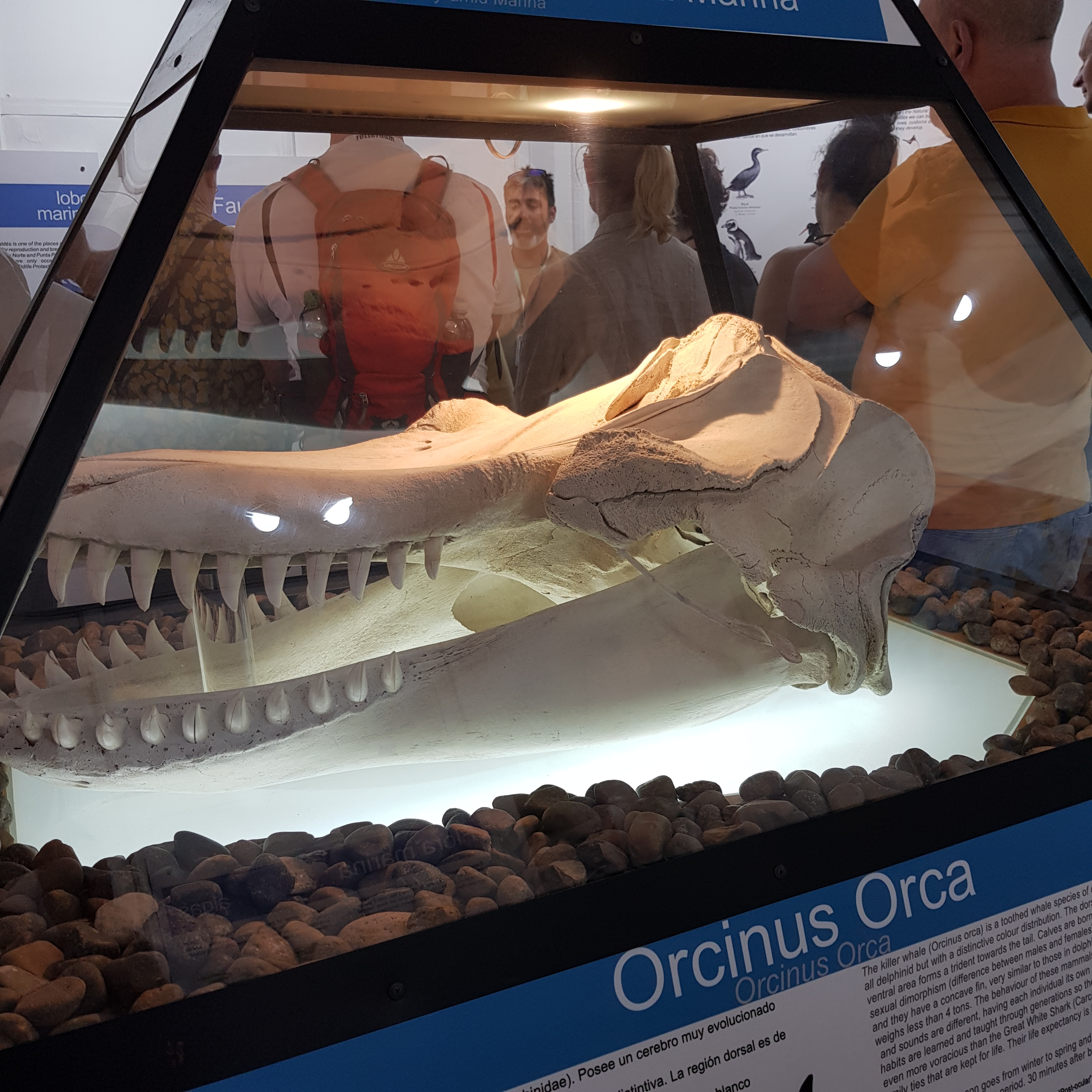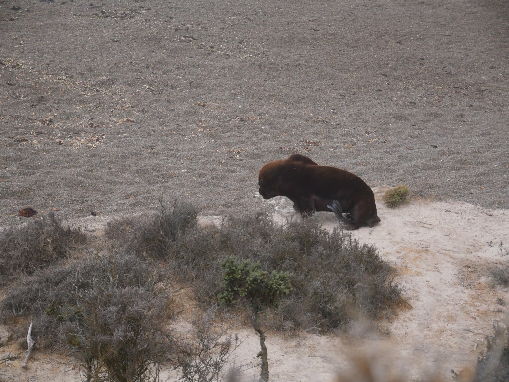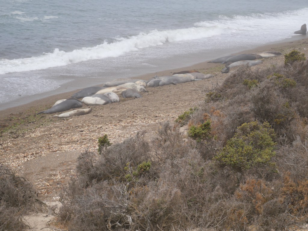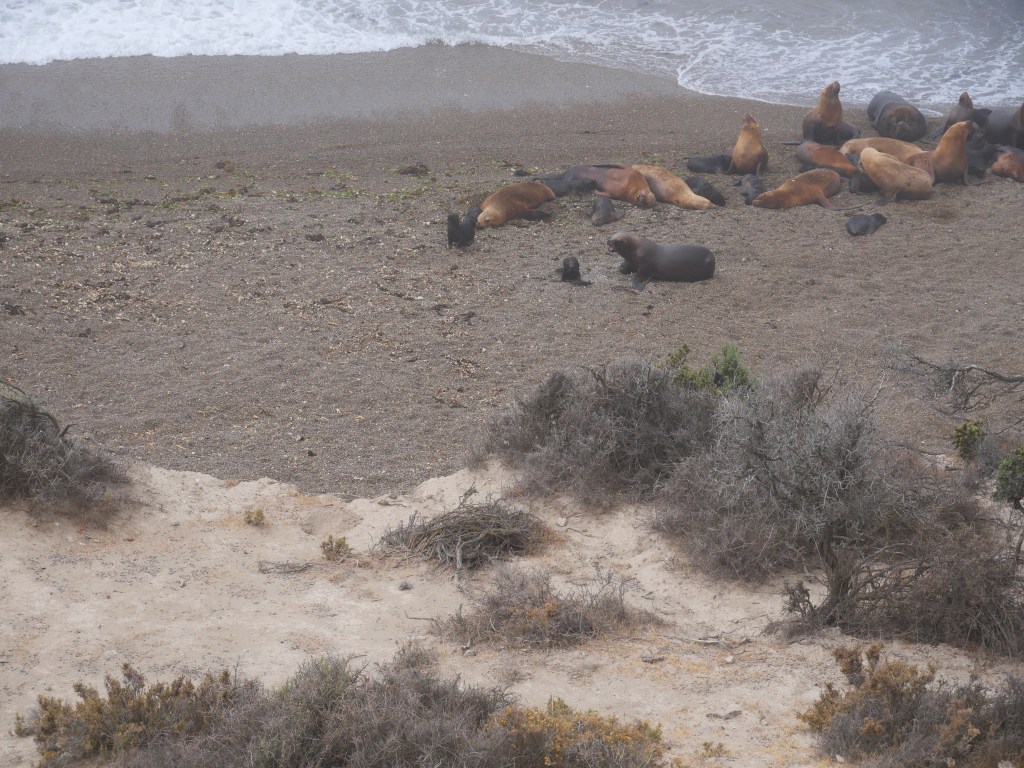 Une fois le ventre plein nous allons à Punta Norte lieu d’observation des lions et des éléphants, c’est également l’endroit où les orques femelle apprennent aux juvéniles à chasser sans tuer leurs proies. Cependant compte tenu de la grande colonie d’éléphants et de lions, les orques sont en train de faire du lieu leur terrain de chasse mais nous ne verrons qu’une réplique en plâtre d’un orque. Les lions de mer sont de la famille des otaries, il pèsent entre 150 et 350kg et plongent jusqu’à 150m pendant 7mn. les éléphants sont quand à eux de la famille des phoques, le mal pèse entre 2 et 4 tonnes la femelle est plus petite et pèse entre 400 et 900kg. Le record de plongée de éléphants est, pour un individu, de 3000m. Dans cette grosse colonie d’éléphants on ne dénombre pas de juvéniles et pour les lions ce sont entre 50 à 60% de moins de juvéniles. Cette baisse notable de natalité est essentiellement due à la grippe aviaire., tout le monde croise les doigts pour que l’année prochaine les taux de reproduction remonte.