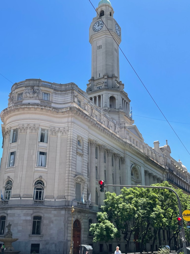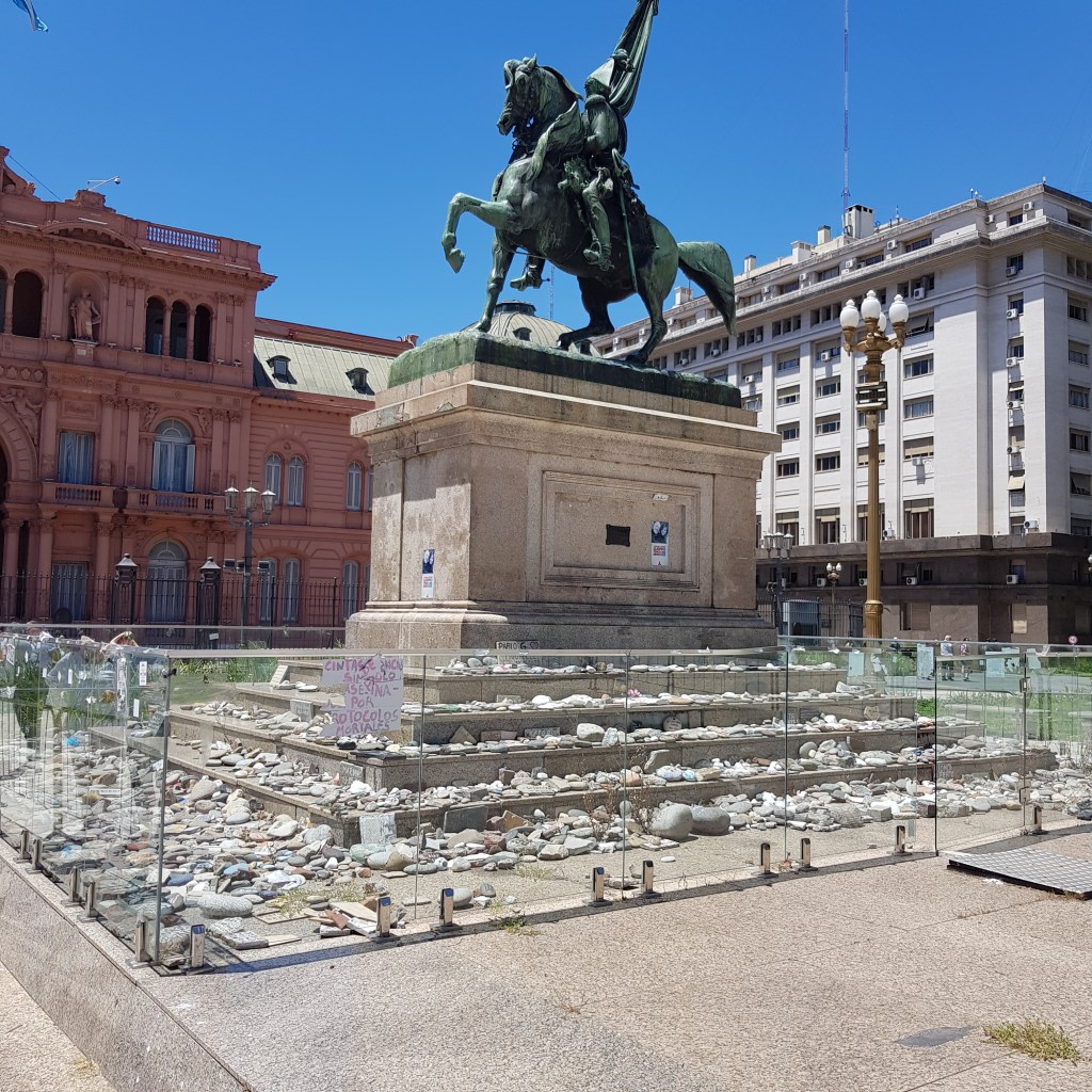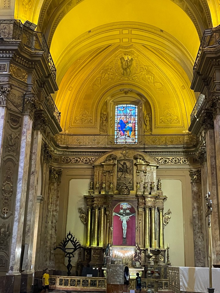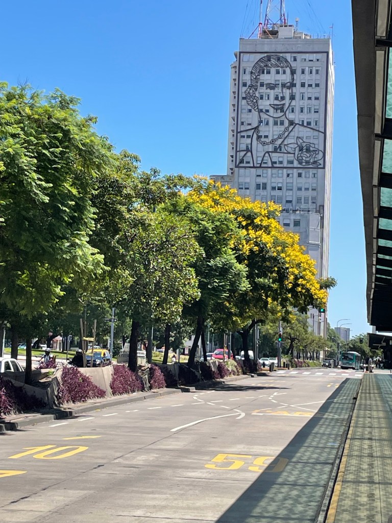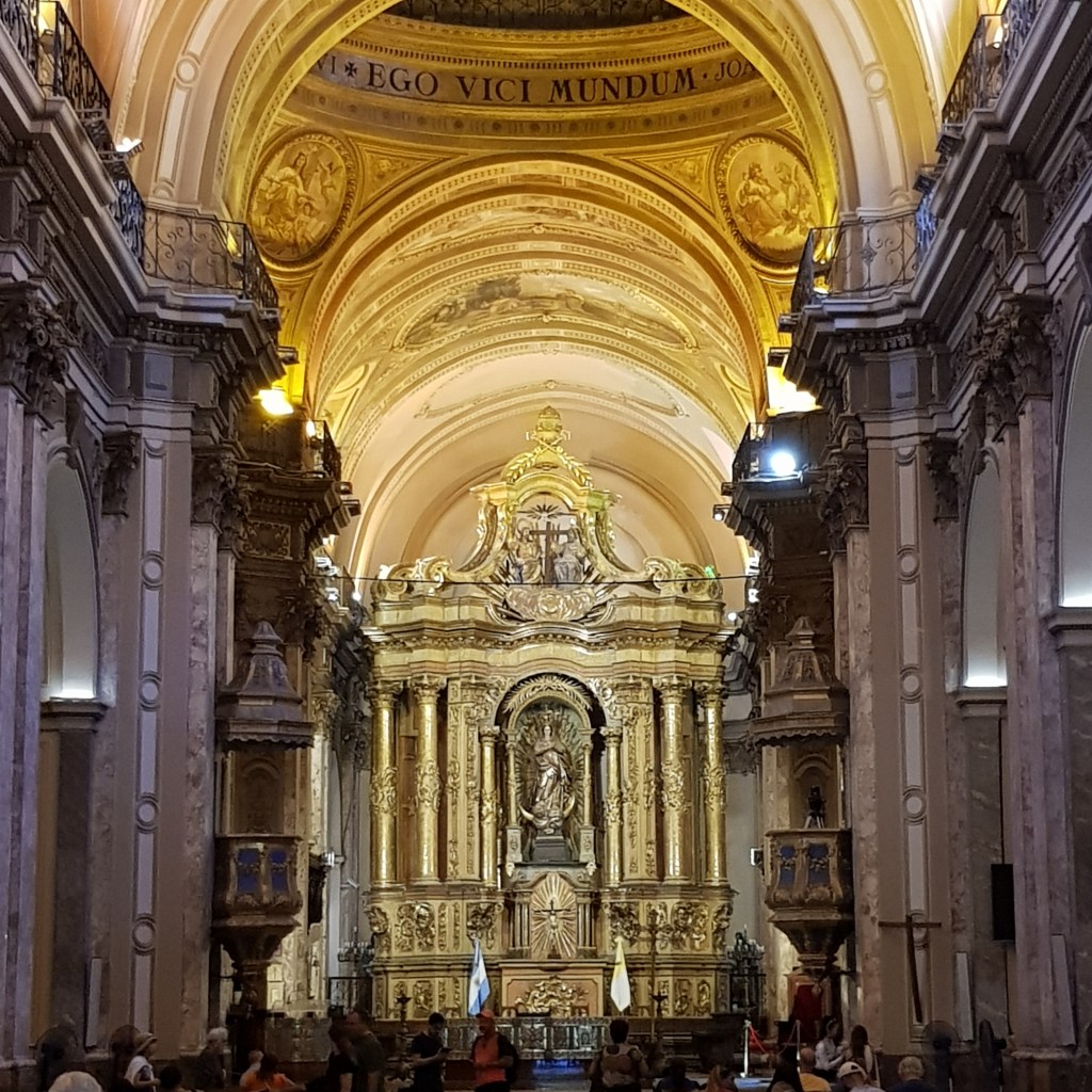 Le lendemain matin vers 10 h nous partons à la pèche au pesos argentins (ARS), et comme nous l’a dit Philippe la veille nous partons en direction du 167 de la rue Bolivar où un Kiosko, sorte de mini supérette, propose au taux bleu ou taux parallèle, un change à 1250 $ (pesos) pour 1 €. Nous changeons 350€ et empochons 375000 ARS, nous retournons directement à l’hôtel pour ne pas avoir une telle somme avec nous toute la journée. Une fois délestés nous prenons la direction Plaza de Mayo et visitons en premier la Cathédral Metropolitana. Nous passons par l’avenue 5 de Julio ou nous pouvons voir un buste d’Eva Peròn, dite Evita, sérigraphié sur la façade d’un immeuble, ce buste est éclairé la nuit