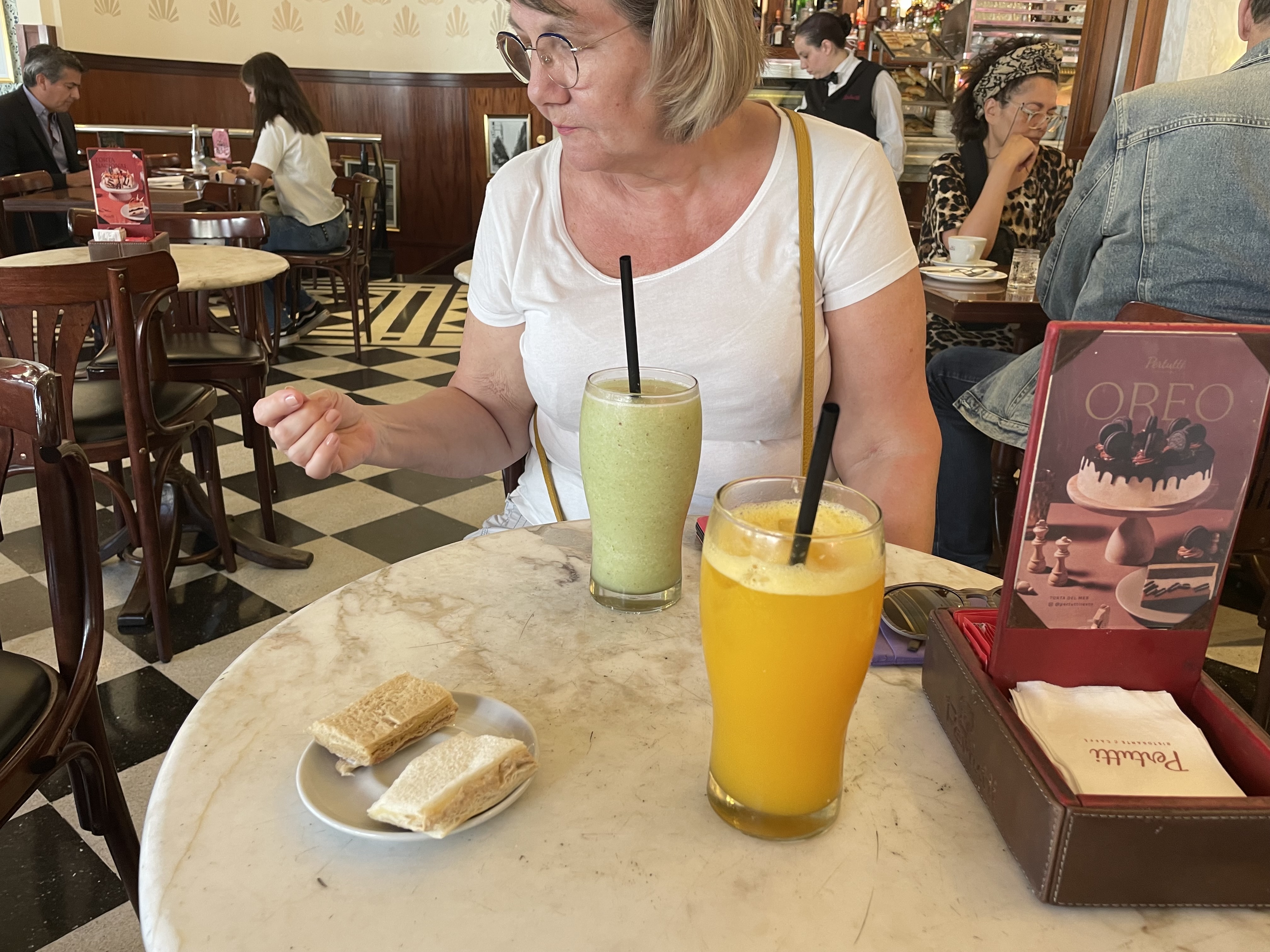 Après la relève nous allons au café Pertutti ou Carine prend un jus de citron menthe et moi un jus d’orange.