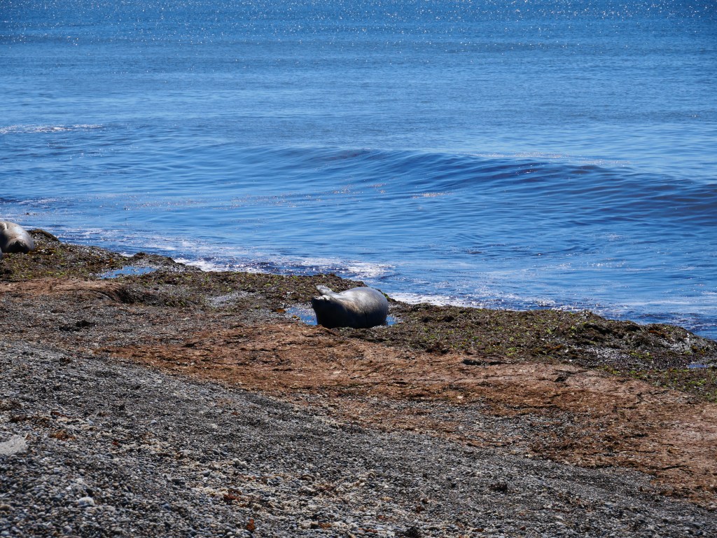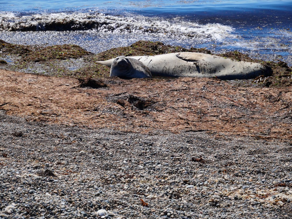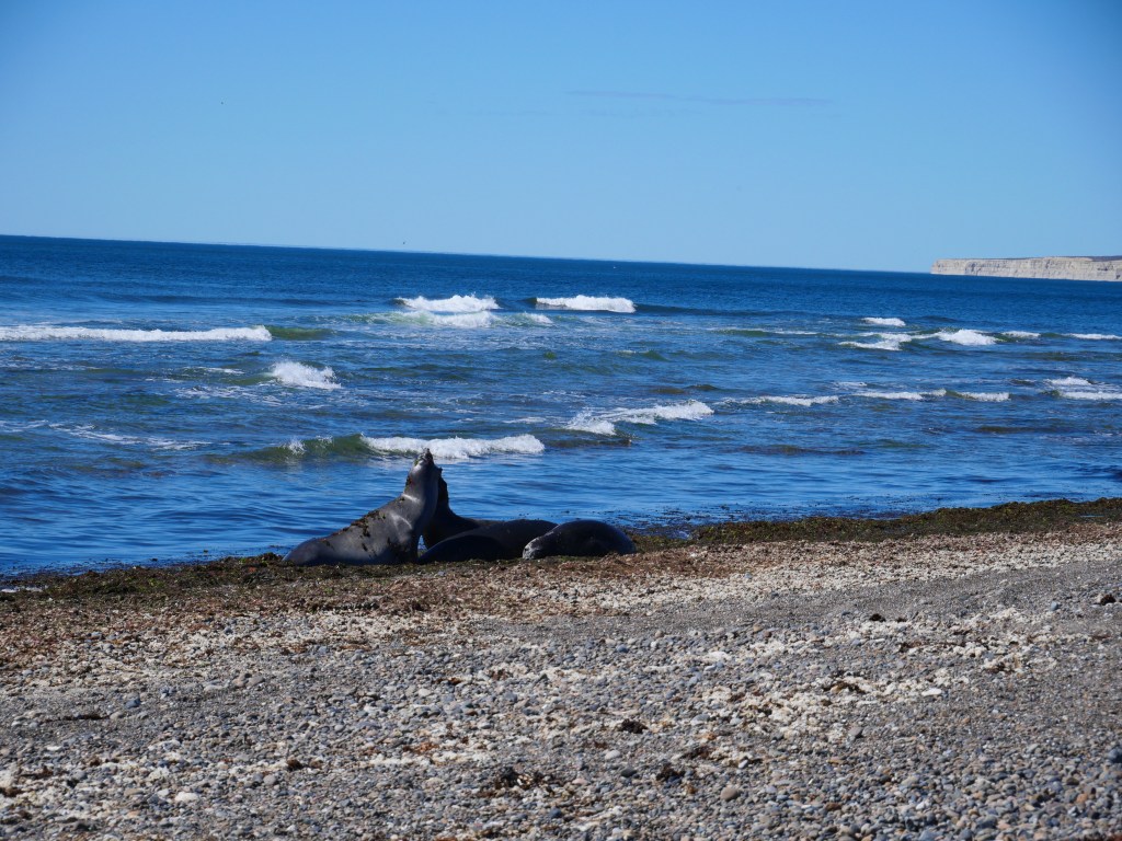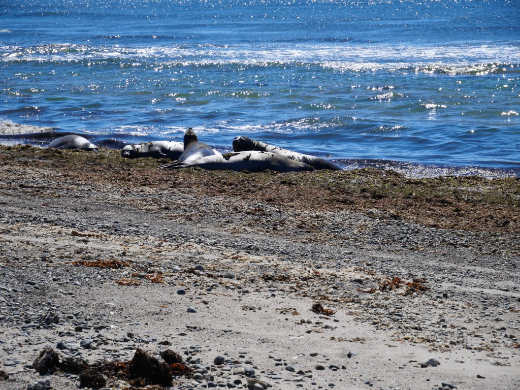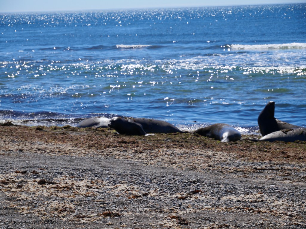 Aujourd’hui, nous avons comme destination Punta Tumbo, Pierre vient donc nous chercher à 9h à l’hôtel. En chemin nous passons par Isla Escondida où il y a plusieurs colonies d’éléphants de mer sur la plage. Nous pouvons ici nous approcher à environ 15m des éléphants, distance minimum pour ne pas les déranger car nous sommes chez eux et non chez nous. Il y a ici une colonies d’une vingtaine d’individus, des jeunes de l’année et quelques jeunes de l’année précédente. Ce sont tous des juvéniles car ils n’ont pas encore de « trompe », cette excroissance qui leur permet d’impressionner les autres mâles lors de la période de reproduction.