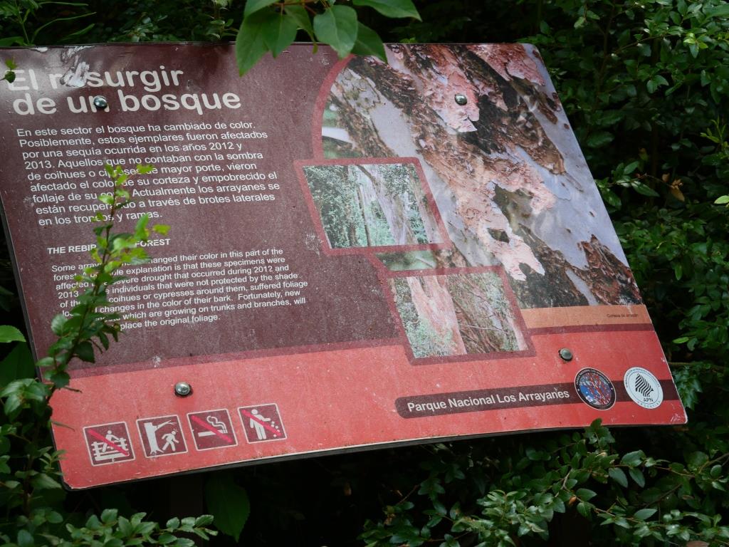 Lorsque l’on pénètre dans cette forêt on est frappé par son côté mystique. L’arrayanes espèce endémique est un exemplaire d’écorce lisse couleur cannelle qui donne cette couleur ocre caractéristique de la forêt, qui a un problème de conservation. En effet, outre la concurrence que représente pour les espèces autochtones l’introduction d’espèces exotiques importées d’Europe, et spécialement le sanglier et le lièvre européen, ainsi que du bétail bovin, le tourisme a été et est la cause de graves dégâts pour la végétation, spécialement pour les arrayanses. Étant donné leur lente croissance, les exemplaires juvéniles sont détruits par inadvertance par les visiteurs. En outre la destruction de la végétation superficielle provoque l’exposition des racines des exemplaires plus âgés, ce qui leur est préjudiciable et dans certain cas de manière irrémédiable.