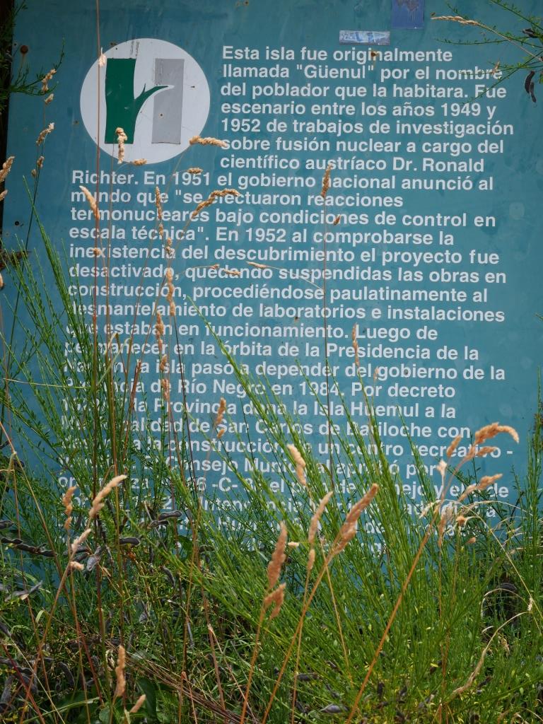 Ce jour est la journée surprise de Boris qui vient nous chercher à 10h30 à l’appartement. Nous allons au sud de Bariloche au kilomètre 10 où sur la plage nous embarquons sur un semi-rigide direction l’ile Huemul. Cette ile n’est accessible que par le lac et uniquement en bateau ce qui limite drastiquement le nombre de visiteurs. Elle a une histoire peu banal en effet, elle a hébergé le projet Huemul, projet secret proposé par le scientifique autrichien Ronald Richter au gouvernement argentin en 1948. À la fin des années 1940, ce Ronald Richter avait persuadé le général Perón, président argentin, que l’énergie de fusion était maîtrisable à l’échelle d’un laboratoire. Il se basait sur le fait que sur une population d’atomes, il y avait statistiquement une fraction (très petite) d’atomes possédant une énergie suffisante pour obtenir la fusion. Perón lui alloua donc un budget qui a permis à Richter de s’équiper avec le matériel le plus avancé de l’époque, et il lui a confié la construction de ses installations sur l’une l’île Huemul. À la suite d’une erreur d’interprétation dans une expérience de Richter, Perón annonça l’obtention de la fusion nucléaire. Malgré cette annonce, qui a suscité beaucoup de controverses, une commission d’enquête à la charge de physiciens argentins est arrivée à la conclusion que Richter n’avait pas obtenu de fusion, et Richter a dû quitter le pays. Le projet a été fermé en 1952.