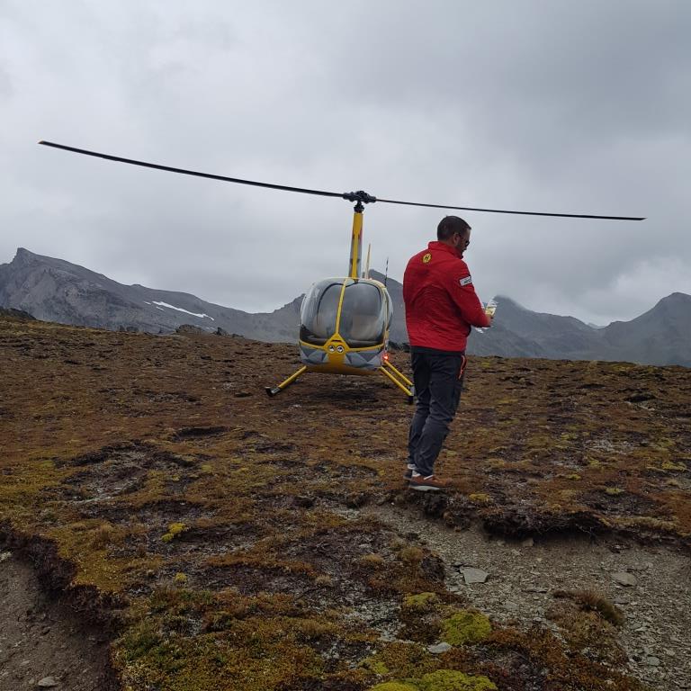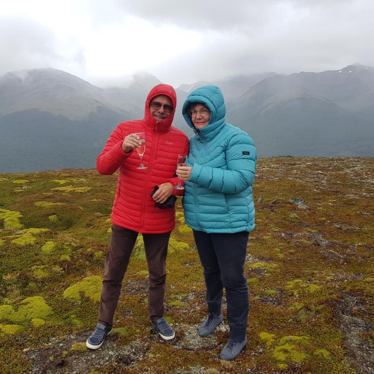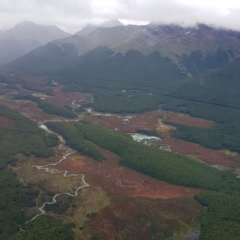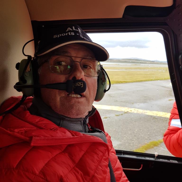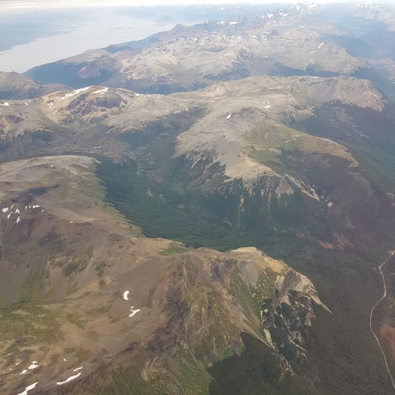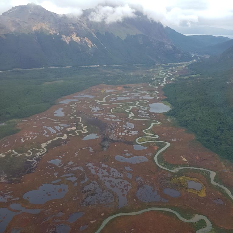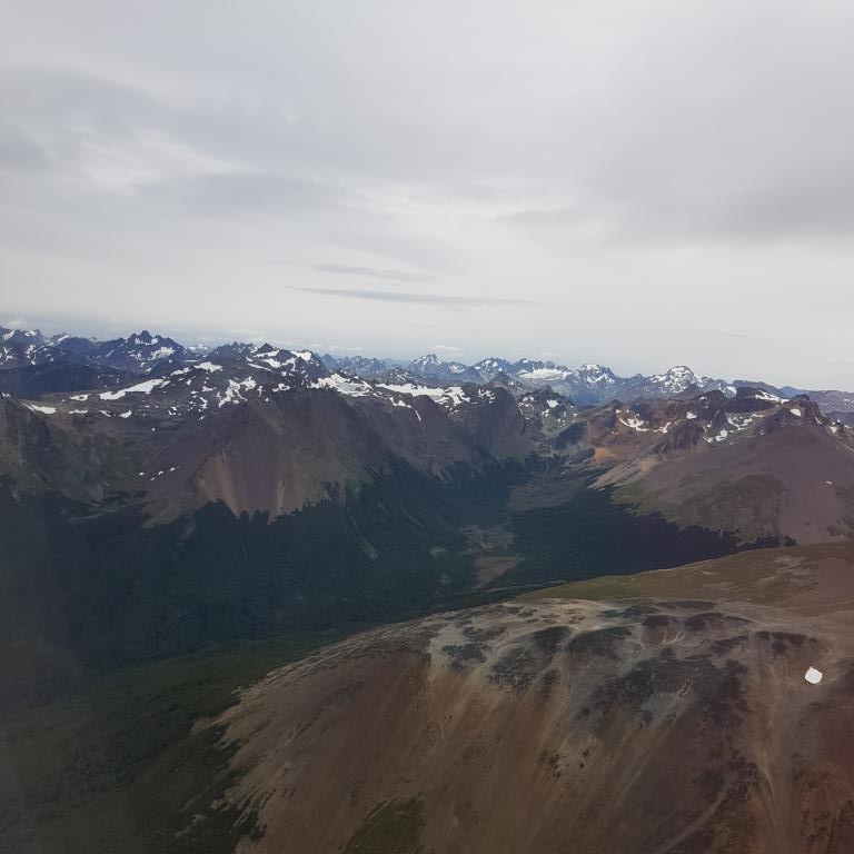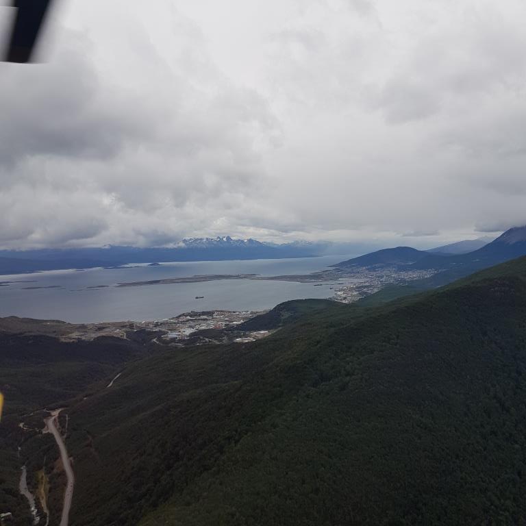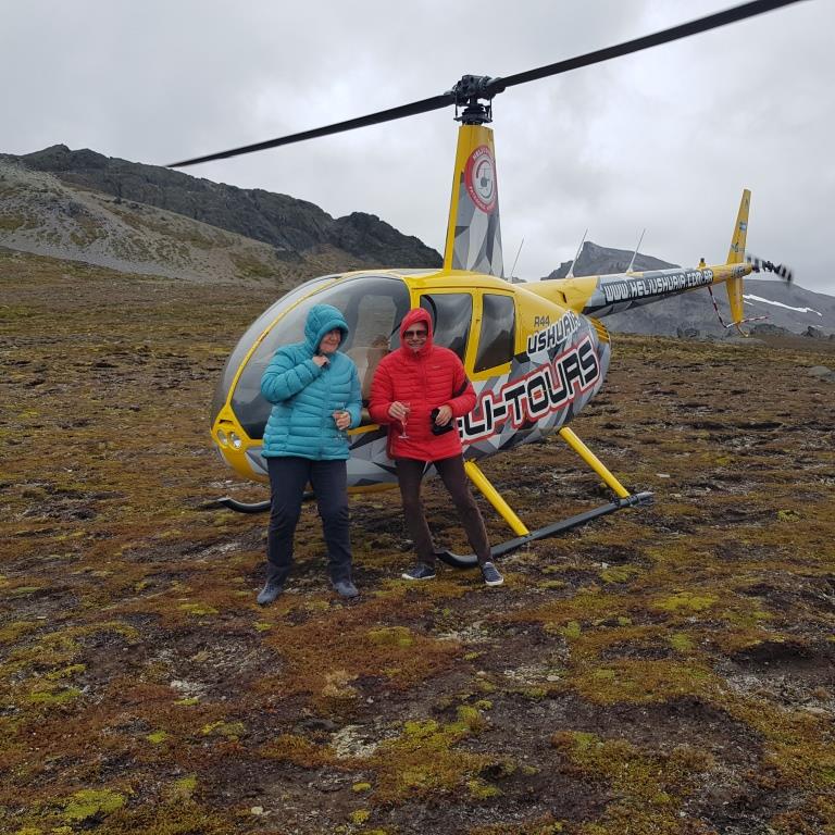 Nous allons ensuite à l’hôtel pour le check-in et intégrer la chambre, nous redescendons à l’accueil pour y attendre le transfert qui doit nous accompagner à l’aérodrome pour notre tour en hélicoptère. Nous décollons à 15h pour 30 minutes de survol de la baie d’Ushuaïa, du canal de Beagel et des environs, nous atterrissons au milieu de nul part en montagne pour un « drink » insolite, puis retour à l’aérodrome. Pour illustrer mon baptême en hélicoptère, mieux vaut des images plutôt qu’un long discours.