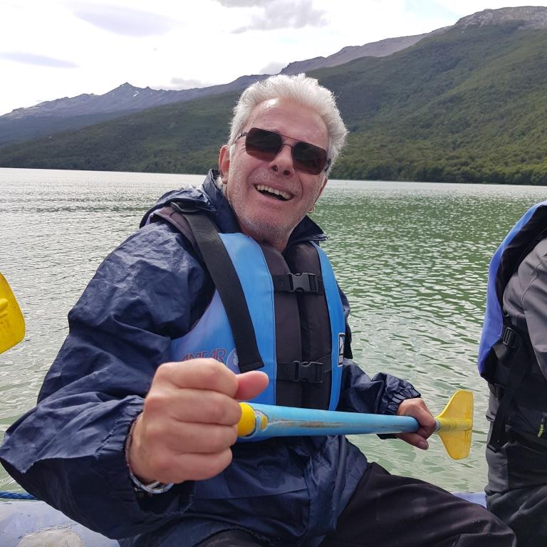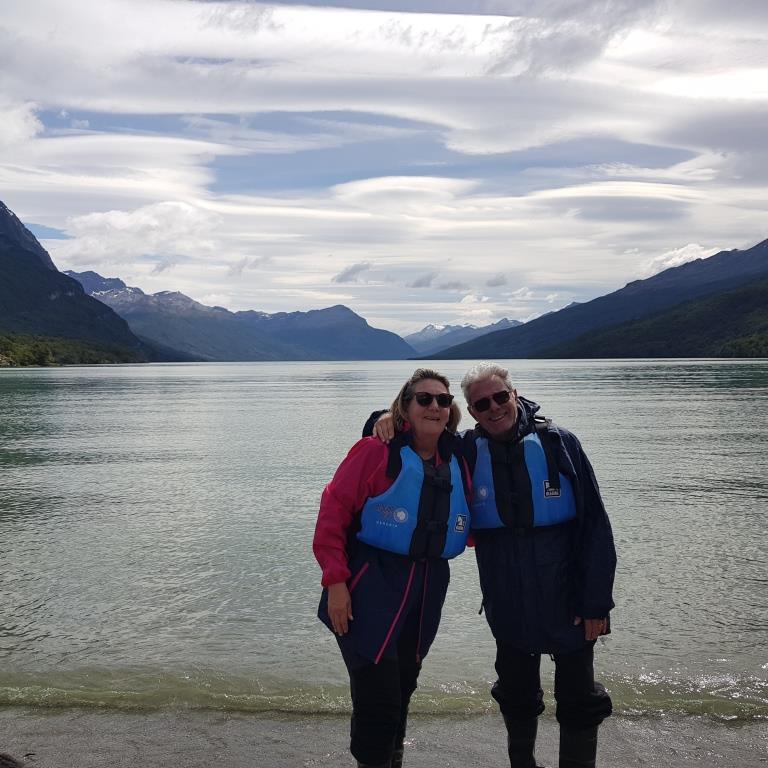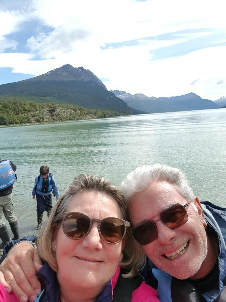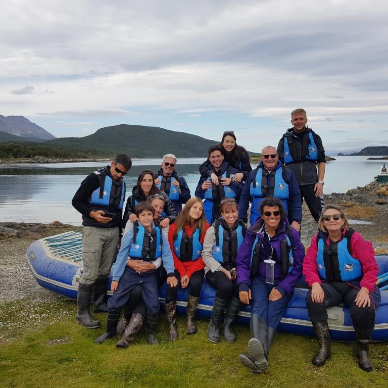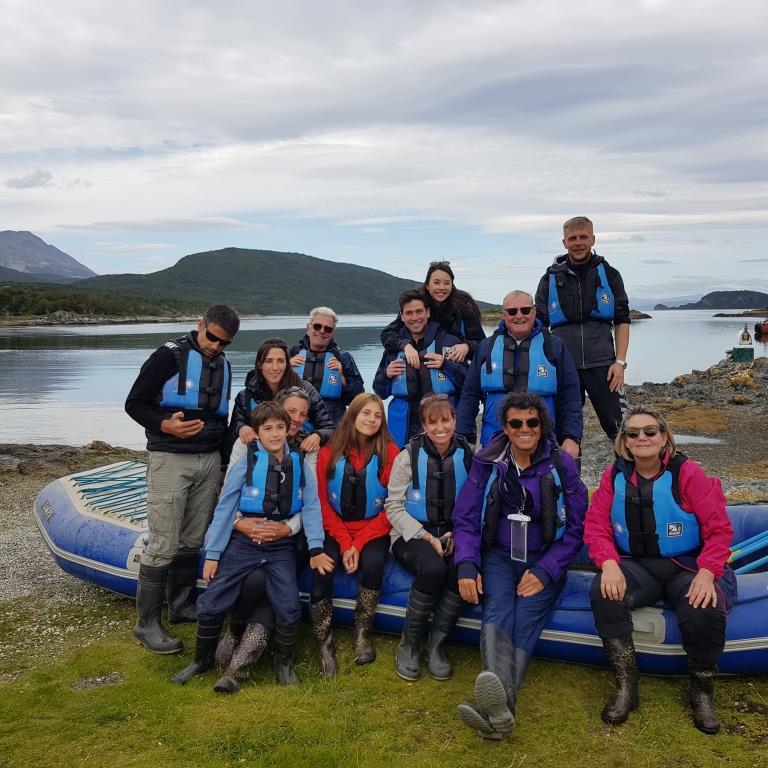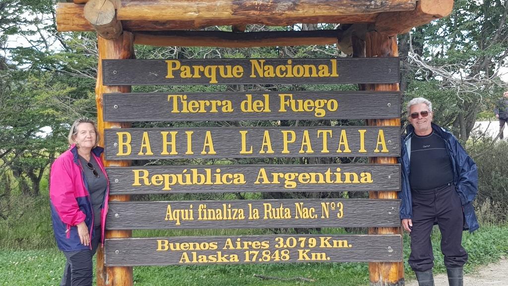 A l’issue du repas nous chaussons des bottes et allons chercher les dunkies (sorte de grand canoé gonflable) pour un heure de navigation pour rejoindre la baie Lapataia. Nous longeons de ilôts ou se reposent des cormorans et autres oiseaux. Ici se termine la route nationale 3 nous y prenons une photo à 17848 km de l’Alaska et 13285 km de Paris.