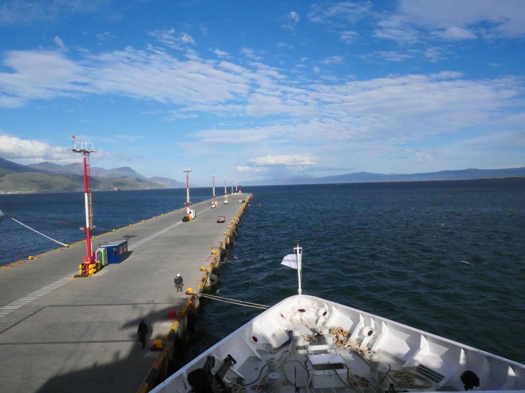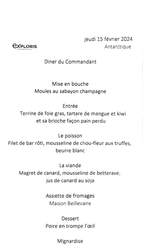 Puis nous passons sur le pont supérieur pour assister à notre départ d’Ushuaïa pour le grand sud sur ce bateau d’exploration des régions polaires : Exploris One. Puis c’est déjà l’heure du diner et nous allons à la salle à manger où nous sommes accueillis par le chef de rang qui nous place. Nous sommes gratifiés d’un menu gastronomique qui s’avère dépasse toutes nos attentes, a priori ce sera comme cela à chaque repas, bonjour le régime.
