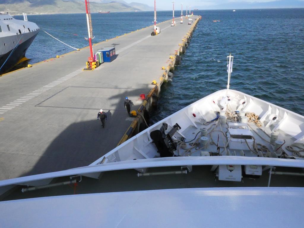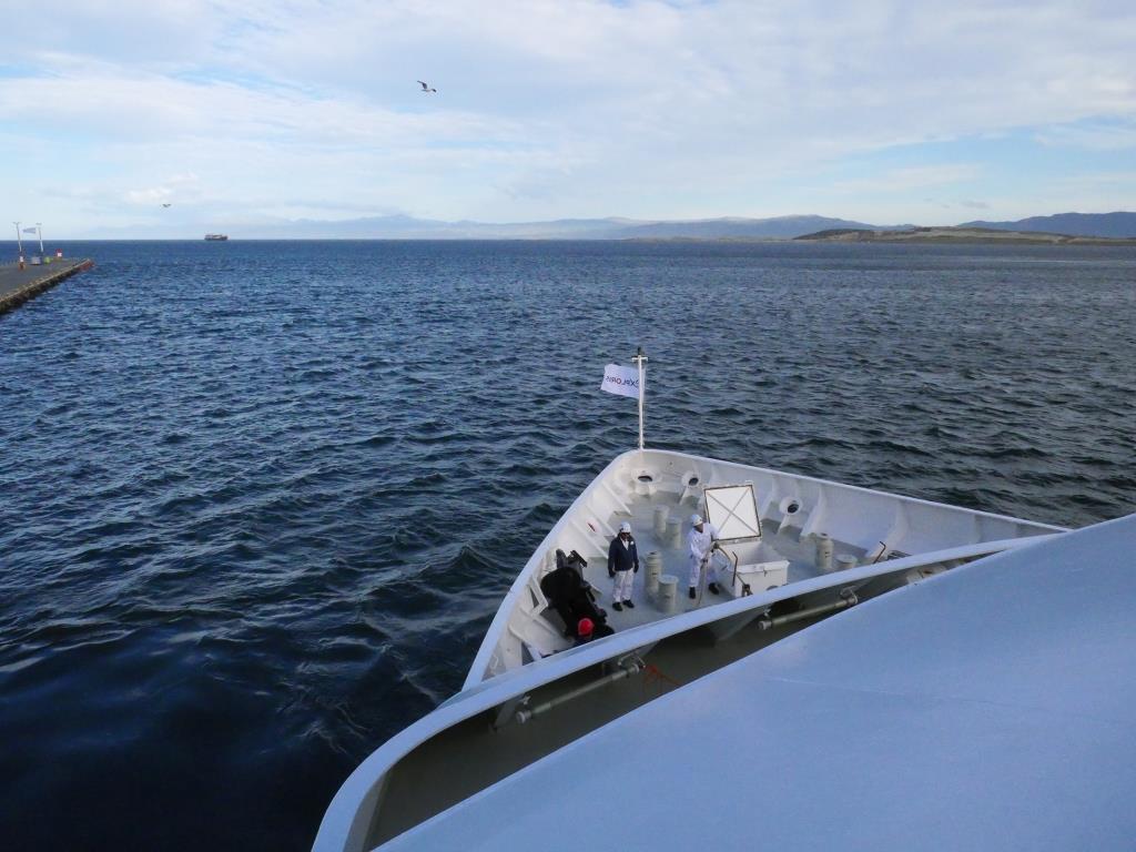 Ensuite, nous assistons à une conférence pour nous sensibiliser aux consignes de sécurité en cas d’obligation de quitter le navire. Puis nous passons sur le pont supérieur pour assister à notre départ d’Ushuaïa pour le grand sud sur ce bateau d’exploration des régions polaires : Exploris One. Mais c’est déjà l’heure du diner et nous allons à la salle à manger où nous sommes accueillis par le chef de rang qui nous place.