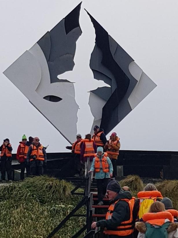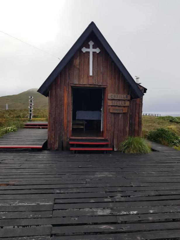 Nous allons jusqu’à la plate forme ou est érigé le monument du Cap Horn, le fameux Albatros. C’est le 5 décembre 1992 que fut officiellement inauguré le Monument du Cap Horn érigé à l’initiative de la section chilienne de la Confrérie des Capitaines du Cap Horn “Cap Horniers”, en mémoire des marins de toutes nationalités qui périrent dans la lutte contre les forces de la nature dans les mers australes proches du légendaire Cap Horn. Ce monument de 7 mètres de hauteur, formé de deux corps indépendants de cinq plaques d’acier chacun, est l’œuvre du sculpteur chilien José Balcells Eyquem. Les plans et la construction de la structure, qui devait supporter des rafales de vents allant jusqu’à 200 km/h, furent réalisés par la Marine chilienne. nous allons ensuite au phare et à l’habitation du gardien, un marin de la marine chilienne qui vit la avec sa famille.