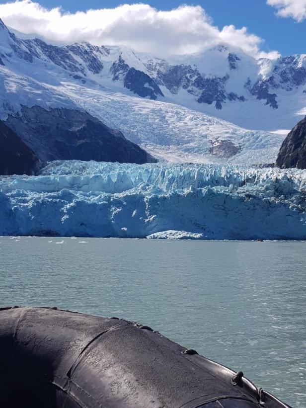 Dans l’après-midi, à bord des bateaux zodiacs, navigation entre de hauts murs rocheux pour arriver au Glacier Porter. Observation en face de la paroi pour y observer ses couleurs, écouter ses sons et avec de la chance, peut-être même observer un éboulement.