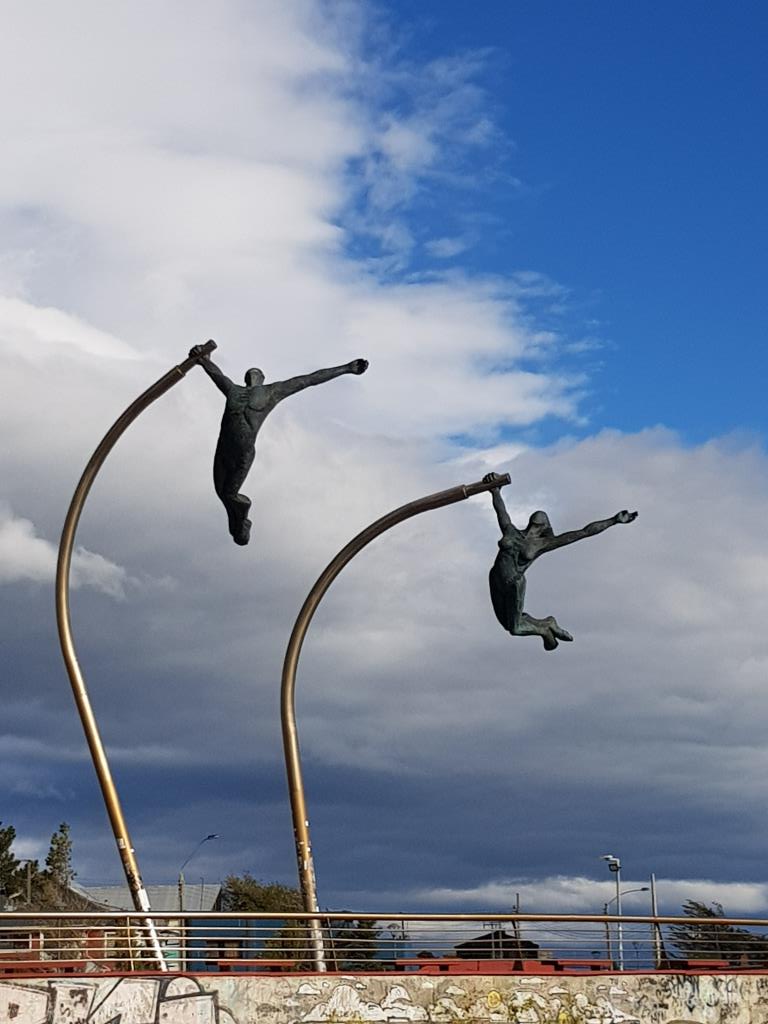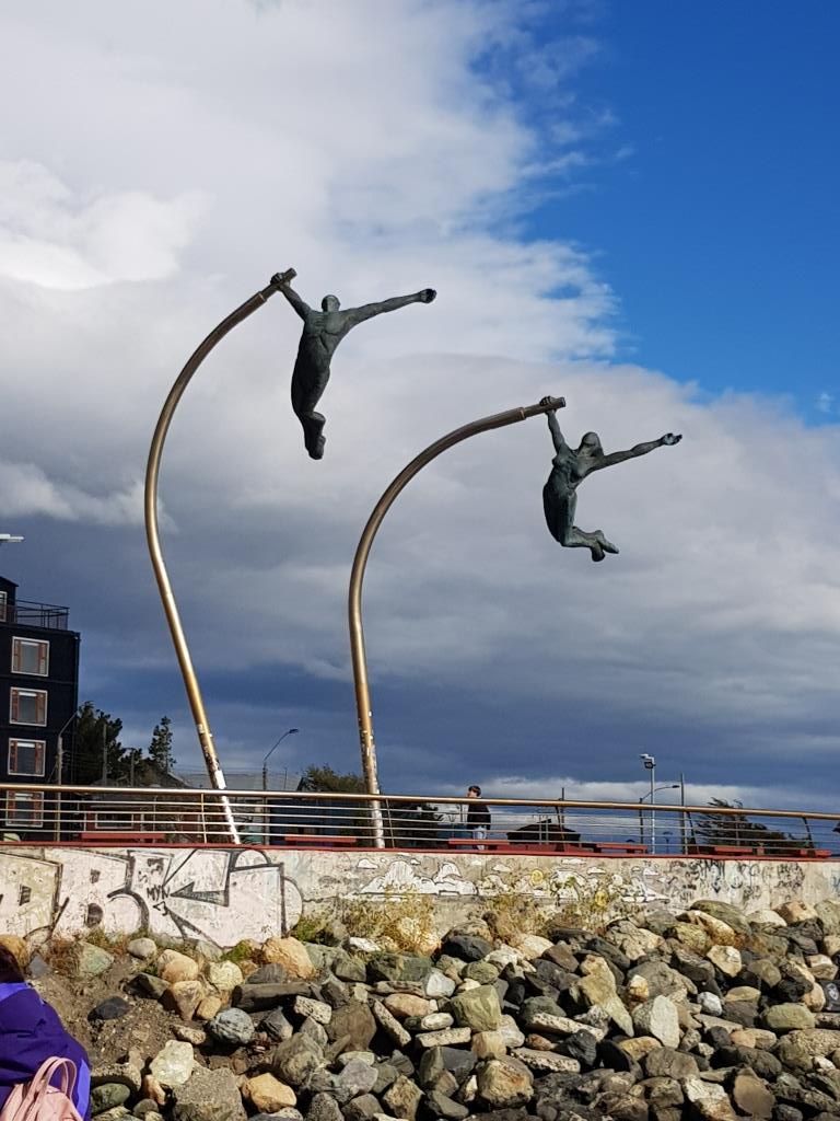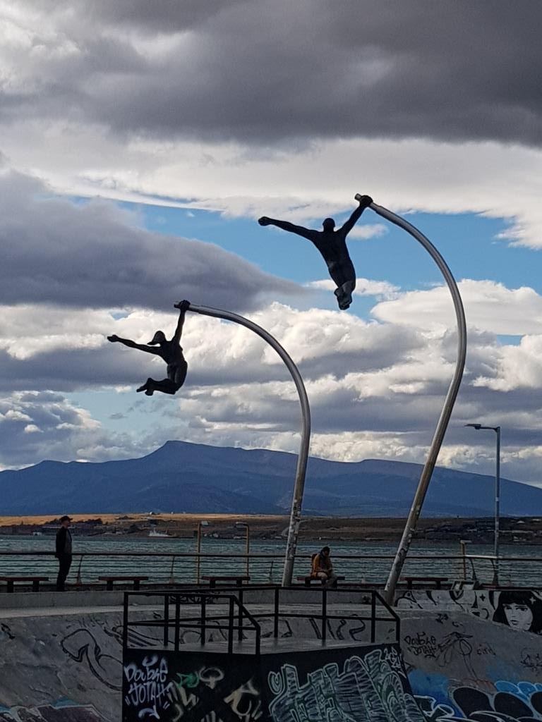 Une fois installés à l’hôtel nous allons faire un tour le long des berges du fjord et cherchons un restaurant pour y dîner. En chemin nous voyons le monument au vent « Amores de Viento » qui se compose de deux figures humaines volantes et a été conçu par la sculpteur Marcela Romagnoli. Il a été inauguré le 1er juin 2012 pour célébrer le 101e anniversaire de Puerto Natales.