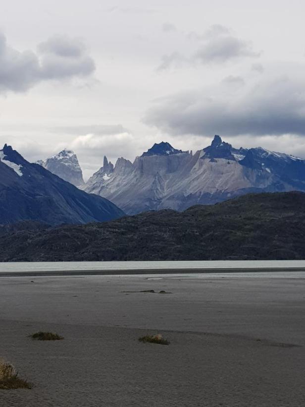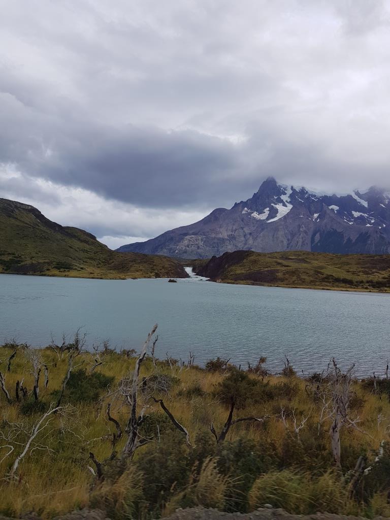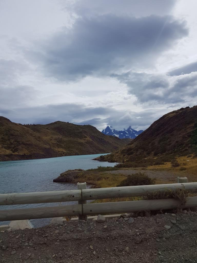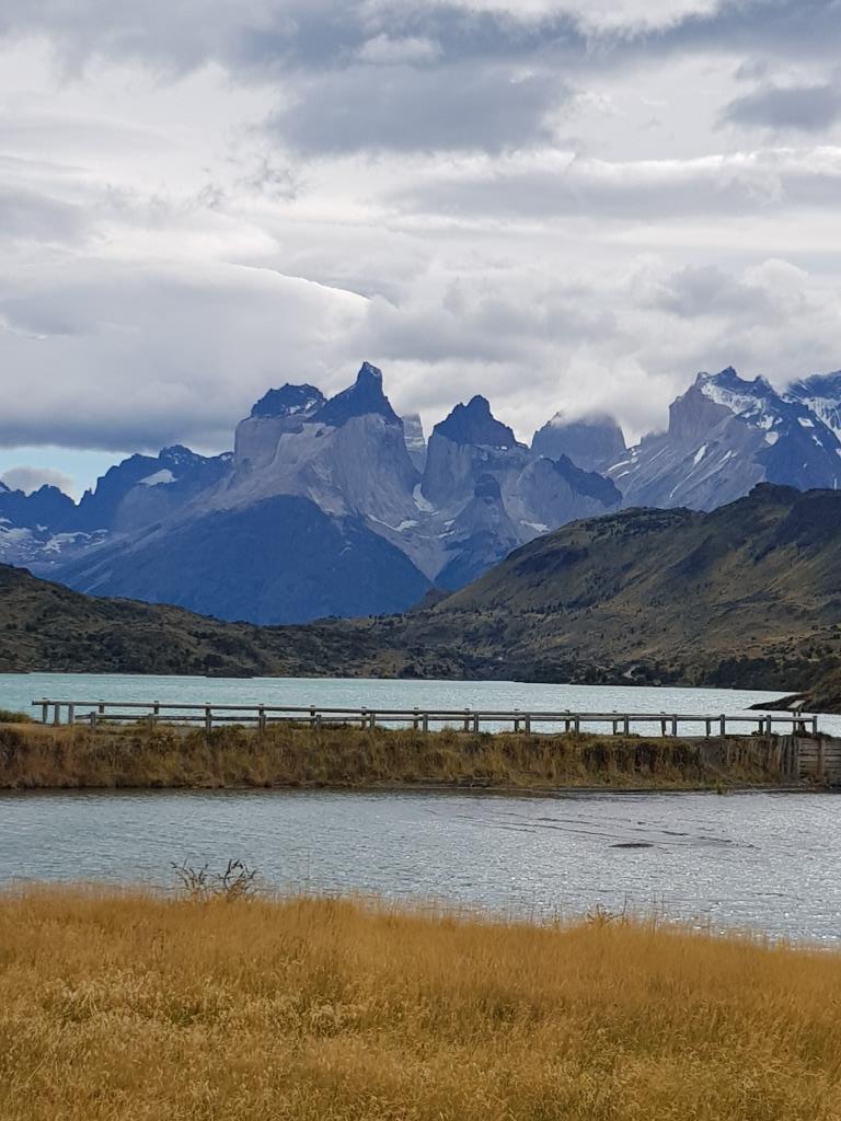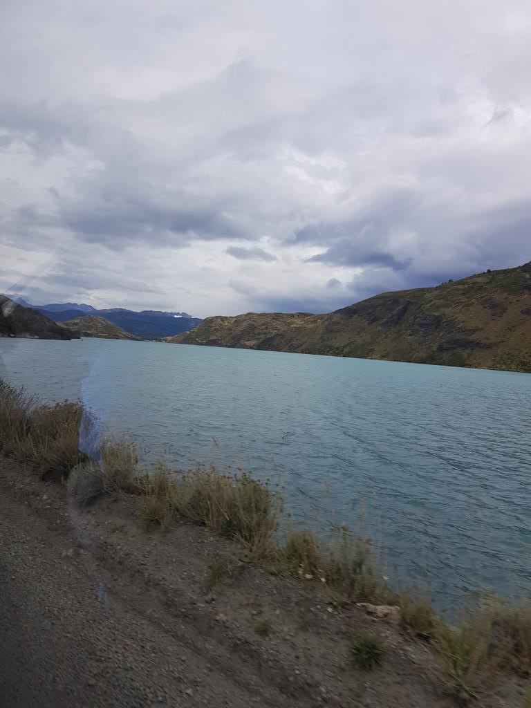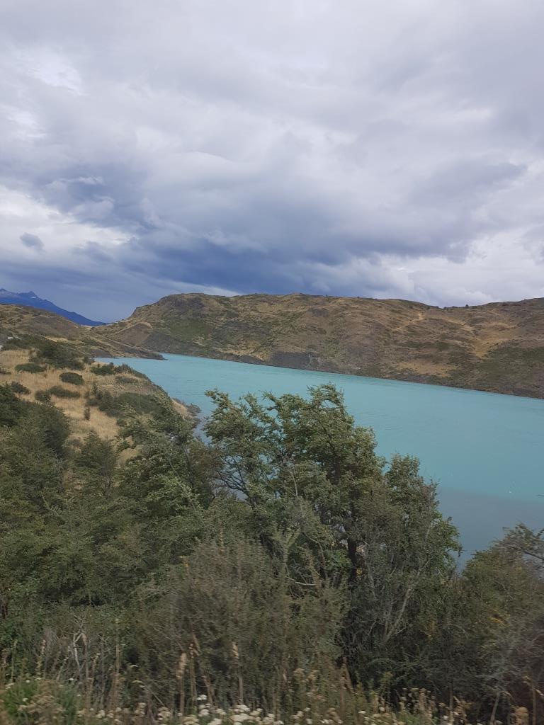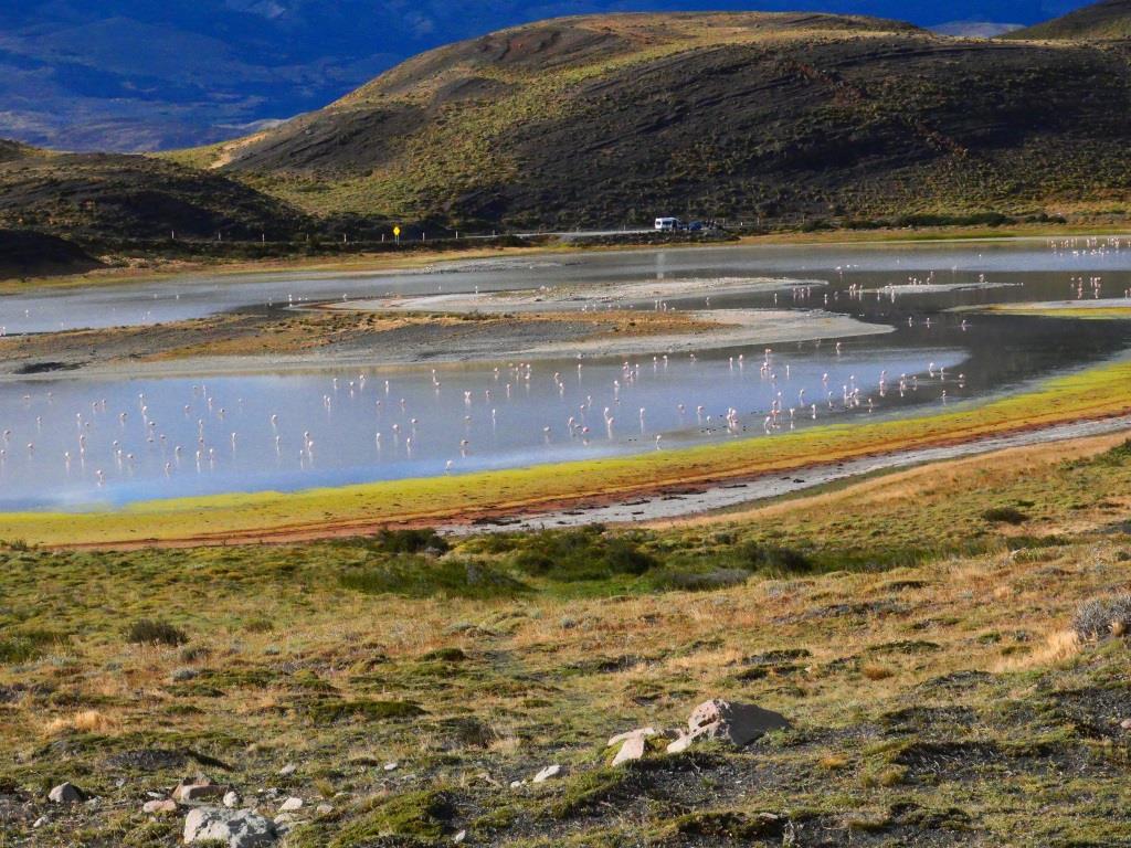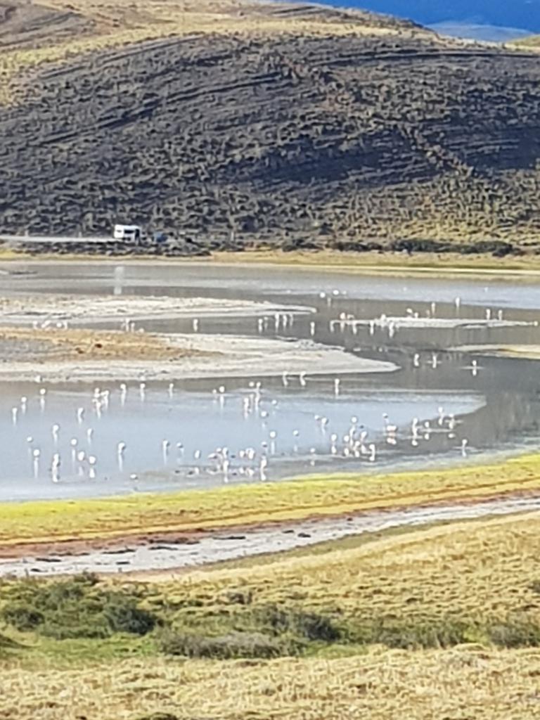 Le lendemain de notre arrivée, notre guide francophone vient nous chercher à l’hôtel à 8h car nous avons 1h30 de route pour être au Parque National Torres del Paine avant l’arrivée des gros bus. En route, la guide nous explique que Paine signifie bleu en langue tehuelche en raison de la couleur dominante. En effet, à voir toutes les tonalités de bleu que nous avons découvertes au cours de nos balades, je dois concéder que le parc porte très bien son nom de bleu. Le beau temps n’est pas au rendez vous, normal pour la Patagonie, nous commençons par le lac Amarga, nous y voyons des flamands roses.