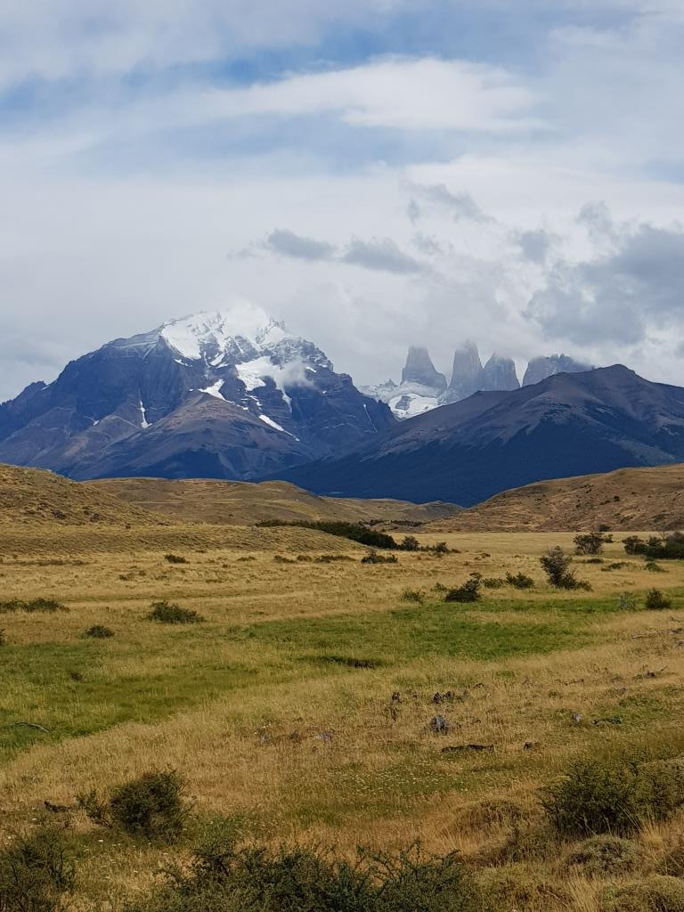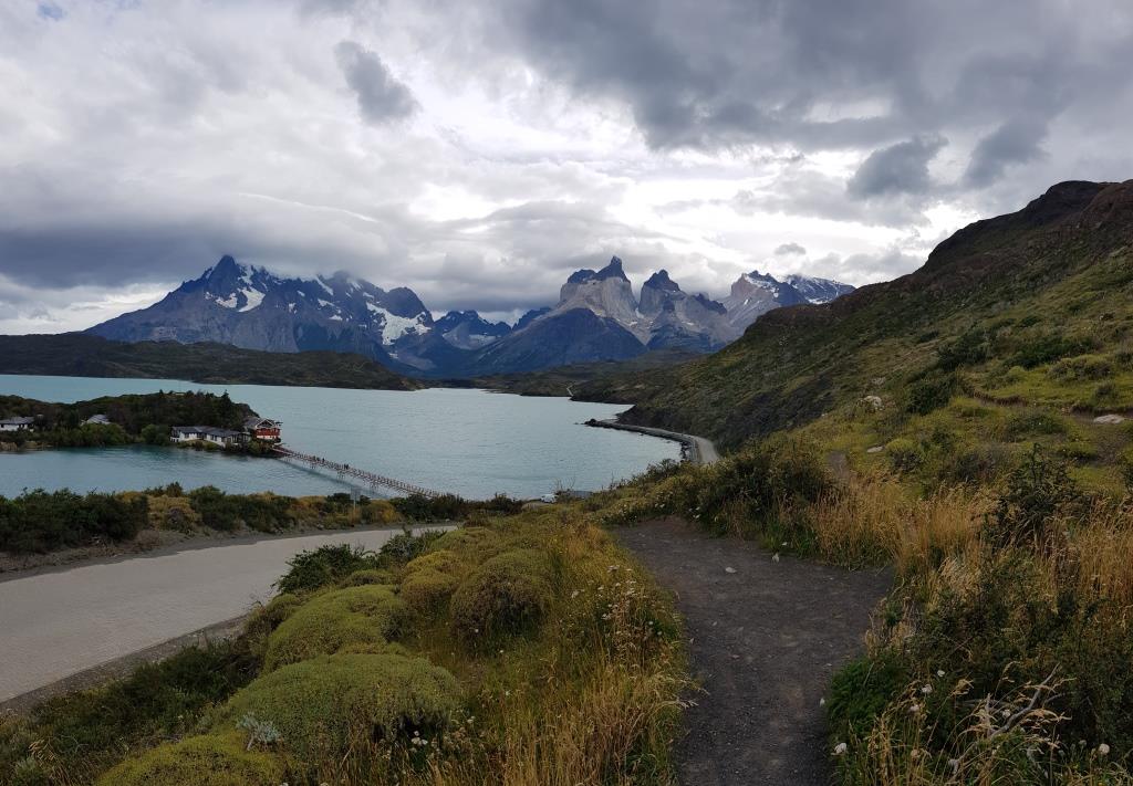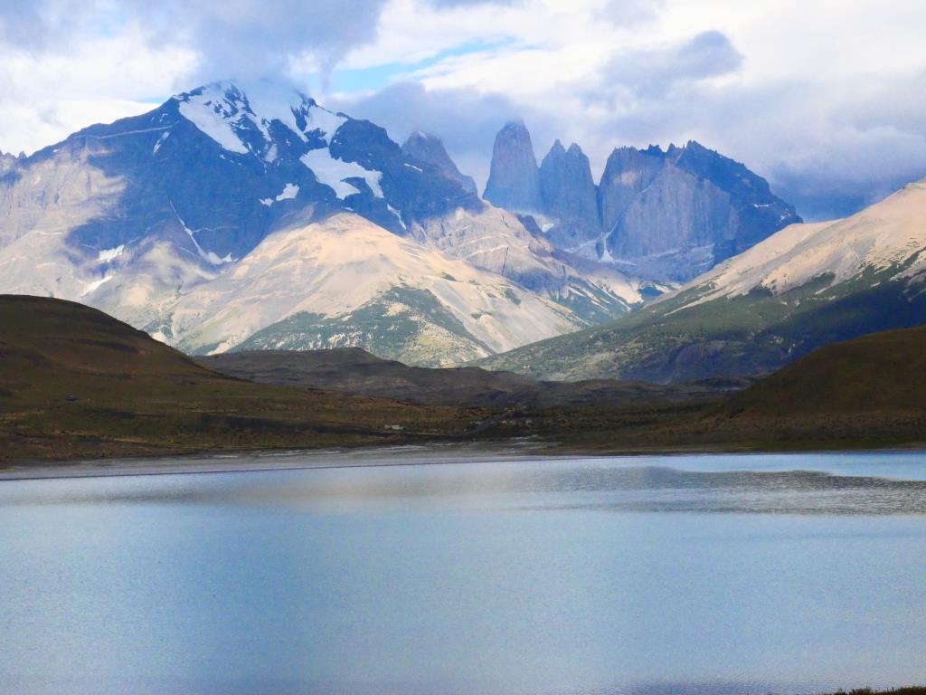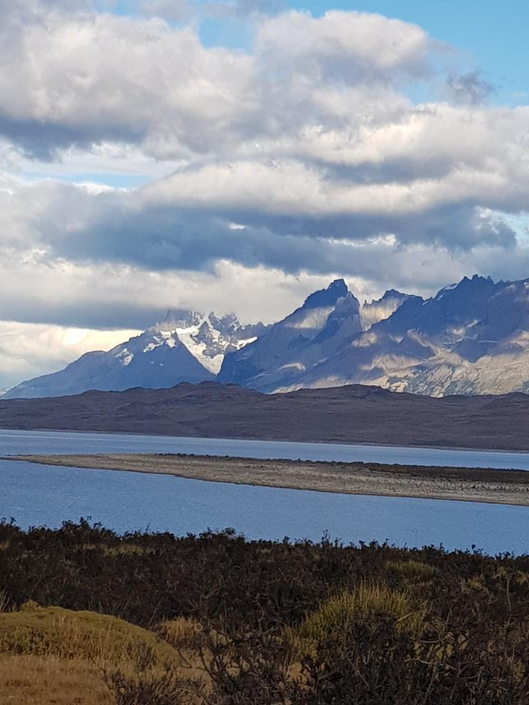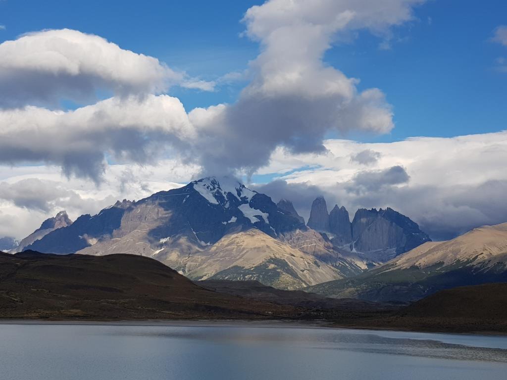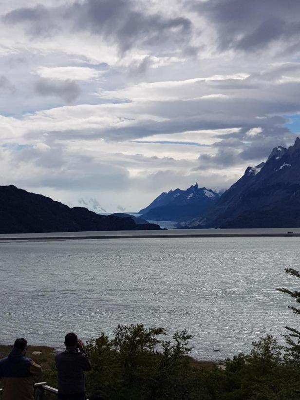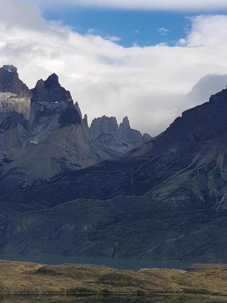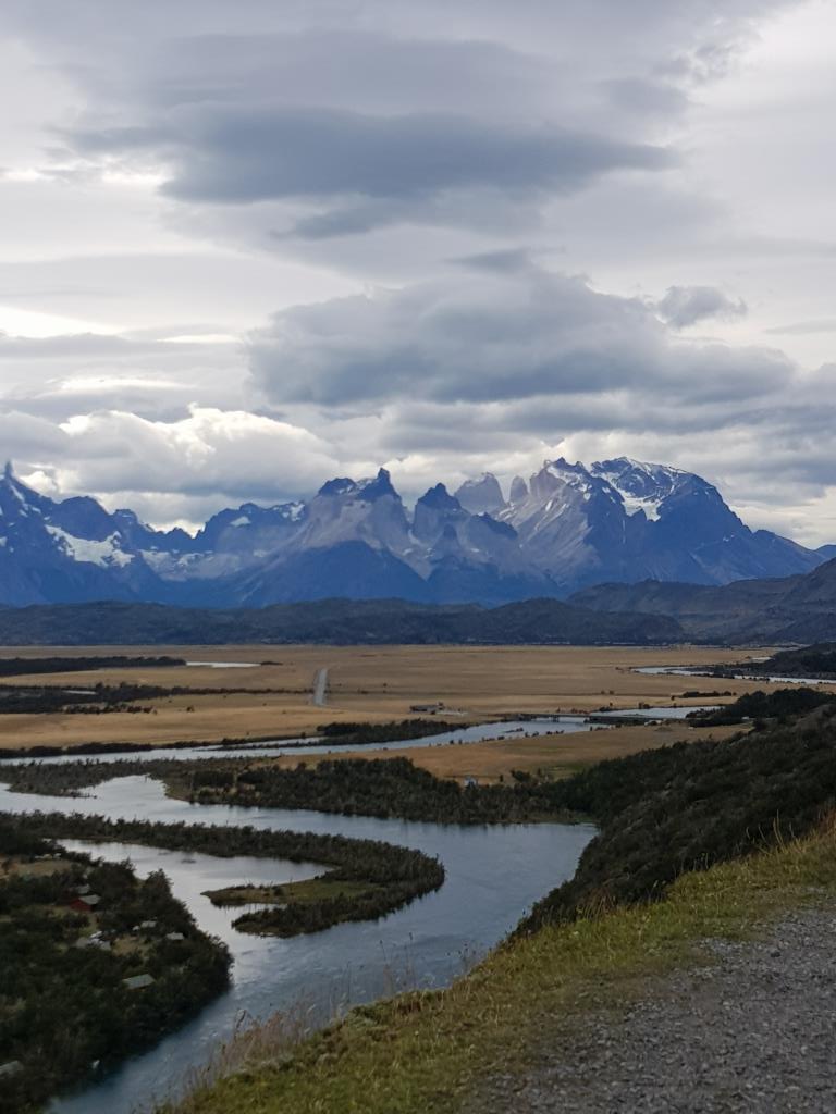 Le lendemain de notre arrivée, notre guide francophone vient nous chercher à l’hôtel à 8h car nous avons 1h30 de route pour être au Parque National Torres del Paine avant l’arrivée des gros bus. En route, la guide nous explique que Paine signifie bleu en langue tehuelche en raison de la couleur dominante. En effet, à voir toutes les tonalités de bleu que nous avons découvertes au cours de nos balades, je dois concéder que le parc porte très bien son nom de bleu. Le beau temps n’est pas au rendez vous, normal pour la Patagonie, nous commençons par le lac Amarga, nous y voyons des flamands roses.
