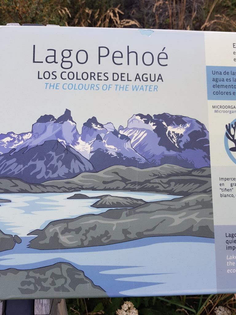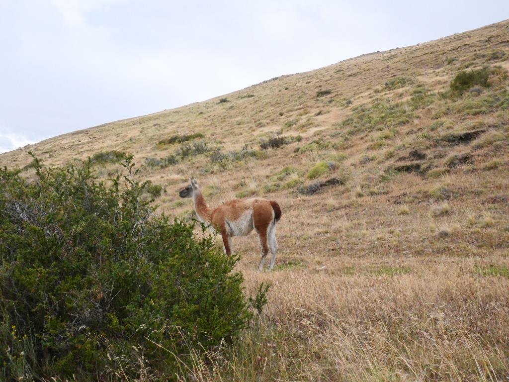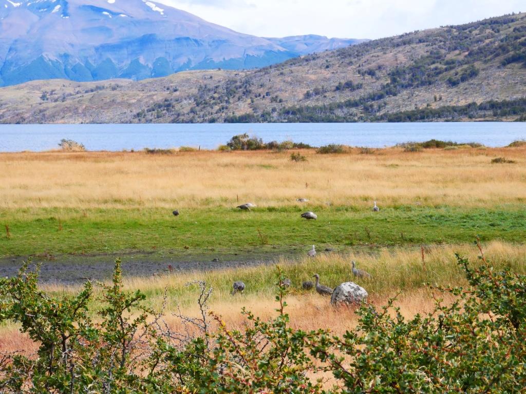 Nous prenons ensuite la direction du Lago Pehoé où nous déjeunons dans une échoppe. Ce sont les eaux du Río Paine qui alimente le lac, eau qui émergent des chutes Salto Grande. Dans les environs des rives nord du lac Pehoé se trouvent une faune et une flore variée, parmi lesquelles des guanacos sauvages.